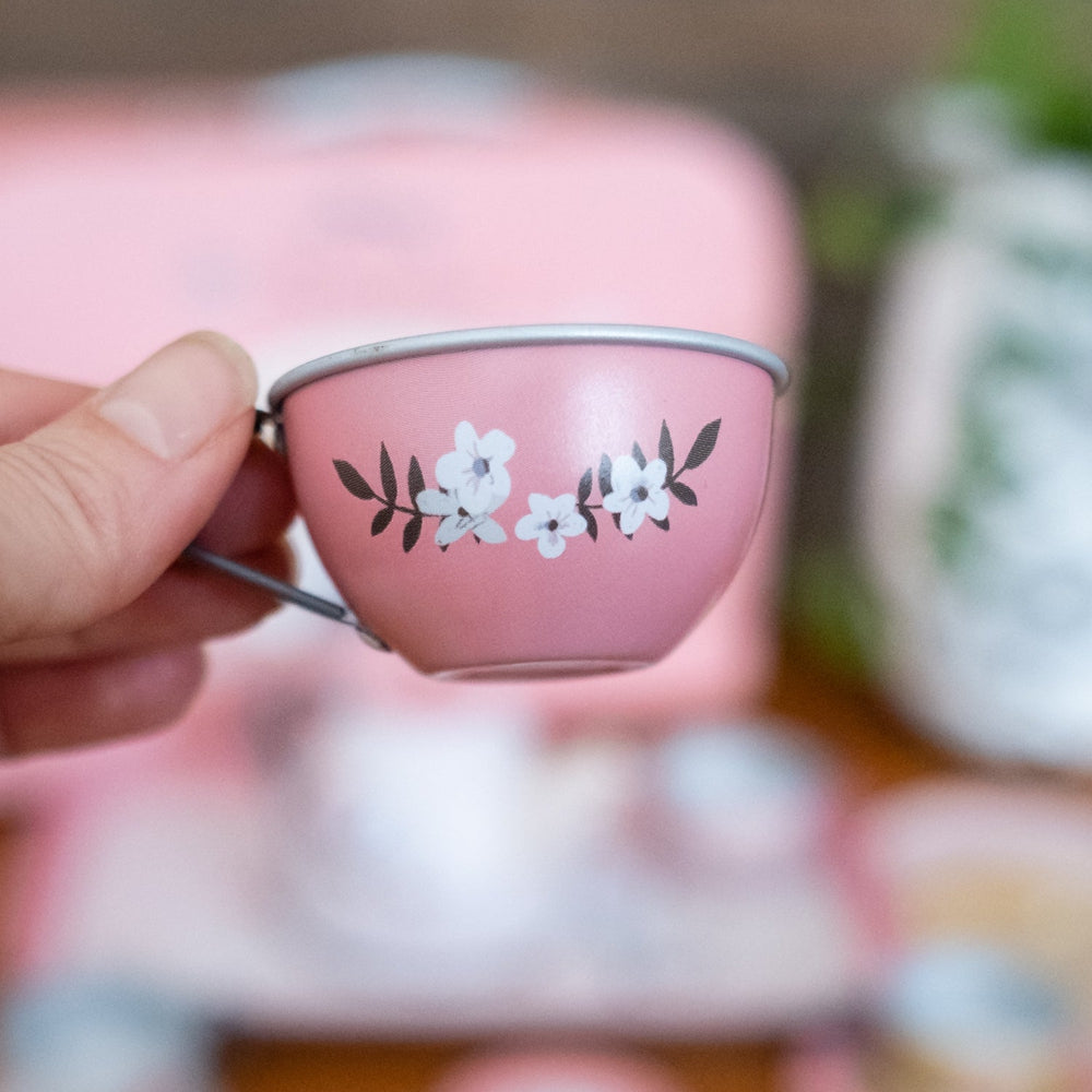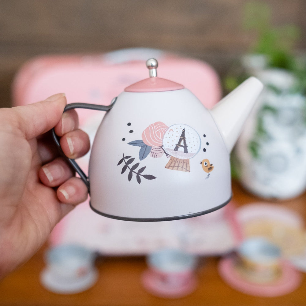Bring a little Parisienne charm to your next tea party! This lovely tea set from Moulin Roty has delicate botanical illustrations and floral hues with iconic images of the Eiffel Tower. The set includes a handy cardboard carry case, metal serving tray, and teapot, as well as 4 teacups, 4 saucers, and 4 plates. Your little one will love serving all their friends, dolls, and stuffed animals with this pretty and sophisticated set. Tea sets are a great imaginative and social toy that are also great for fine motor skills and sharing.