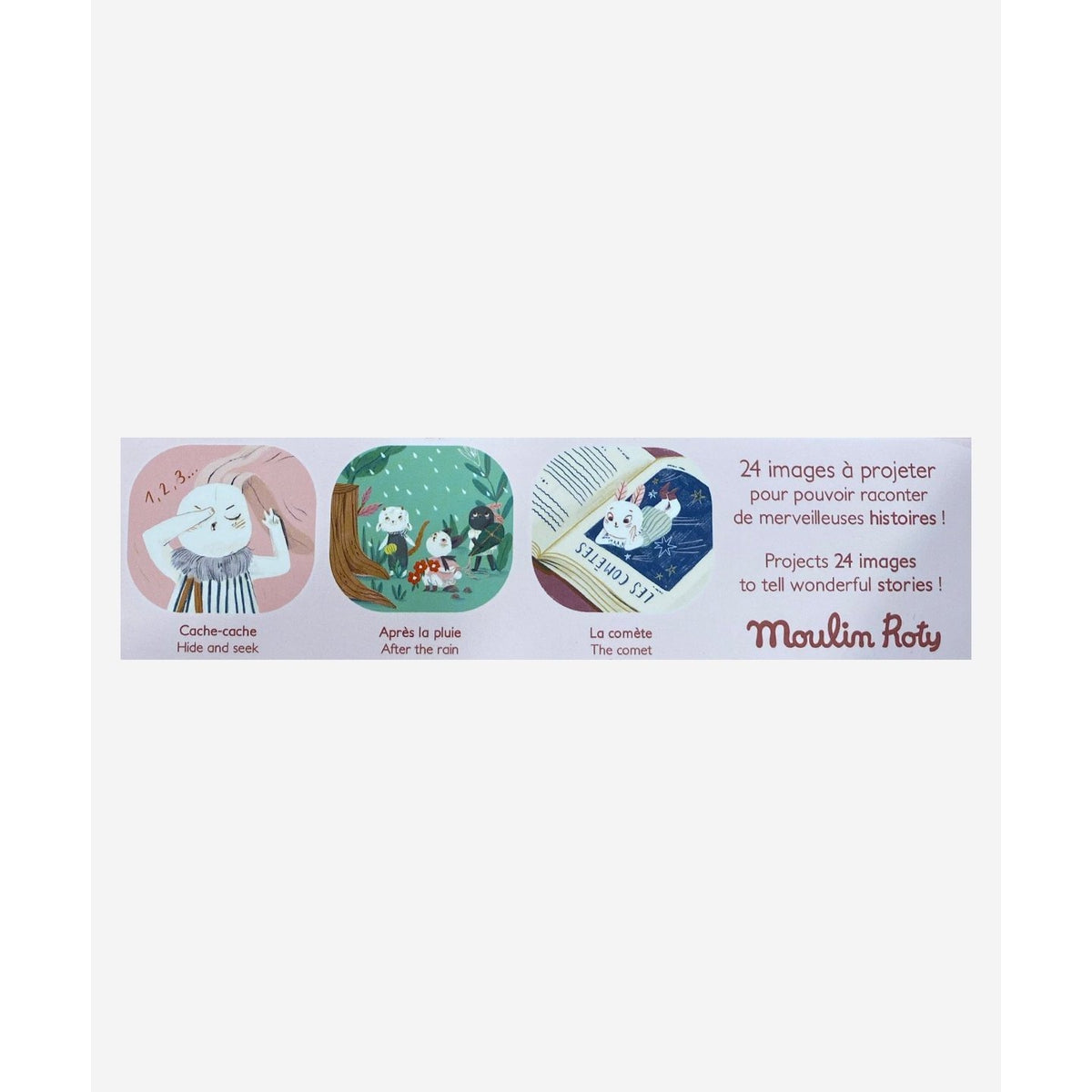 This storybook torch is not to be confused with a simple flashlight. With three discs that clip onto the end of the torch, you can project images onto the wall that inspire creative storytelling fun! Simply slot a "apres la pluie" (after the rain) disc into the storybook torch, turn out the lights, and point against a wall or ceiling to see the illuminated images. You and your little ones can use the illustrated pictures to create whimsical and unique stories - no two will ever be the same! Encourage story time and imaginative skills with this fun and compact toy.