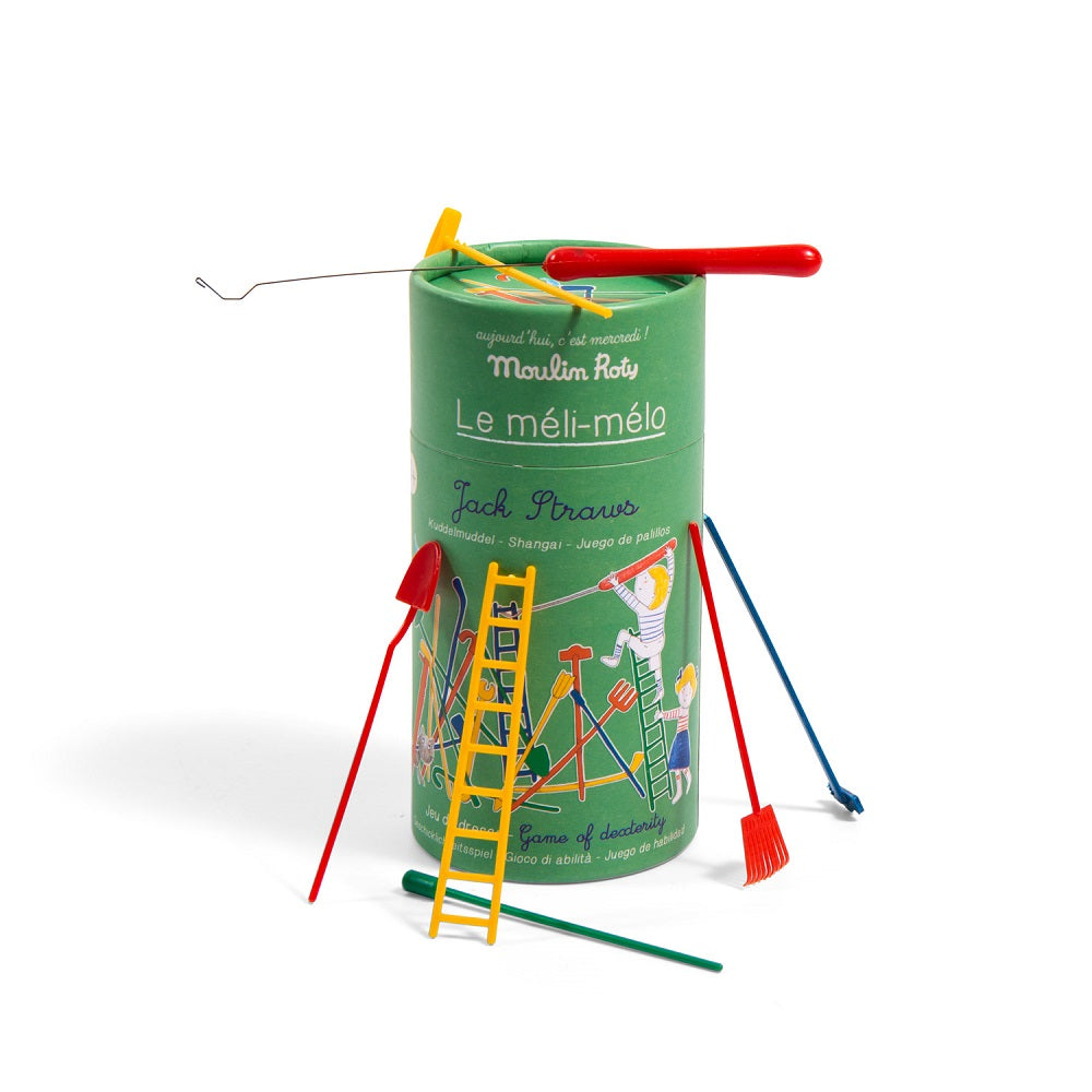 Jack Straws is a classic game for testing one's steady-hand skills and hand-eye coordination. Using a hook, each player tries to collect the most straws, in different shapes and colours depending on their value, without moving any of the others. If any other pieces wiggle, your turn passes onto the next player. Add up the value of each of your collected pieces at the end to see who won! A game of skill with no maximum number of players!