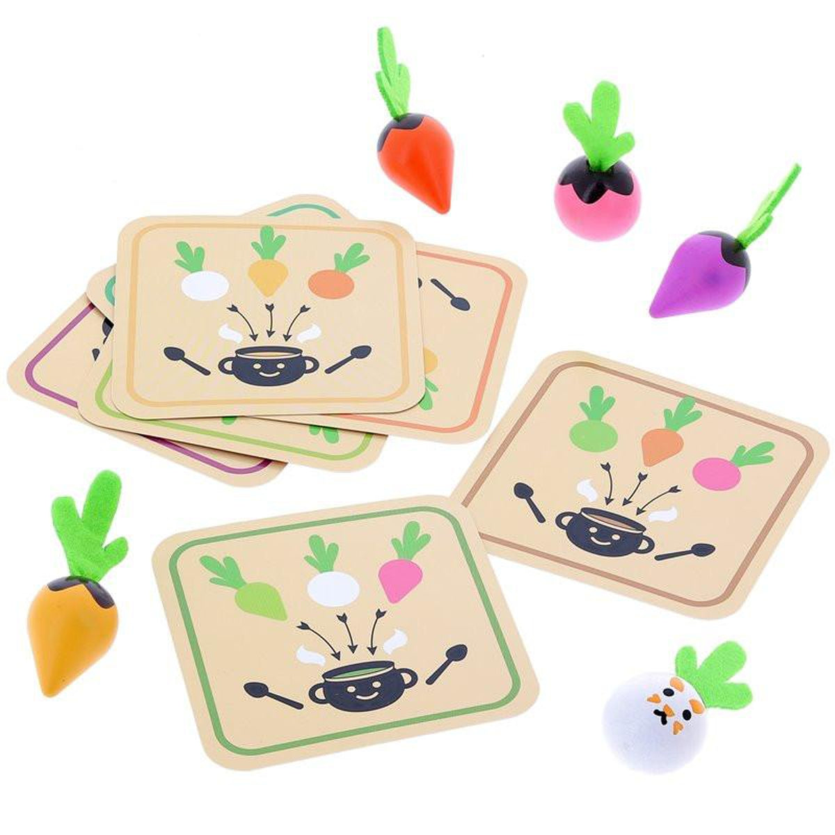 This unique memory game from Vilac is engaging, creative, and fun! Each player is given a soup card with the vegetables they need to collect from the garden to make their soup. Can you remember where the carrot was, or the turnip, or the beet? Be the first to use your memory skills and collect all the vegetables for your soup to win. This game comes with a fantastic mini wooden garden box filled with hidden vegetable crops that you can pull out of the felt "soil". Memory games are fantastic skill builders for concentration, focus, and visual recognition, and this set helps with vocabulary of veggies too!