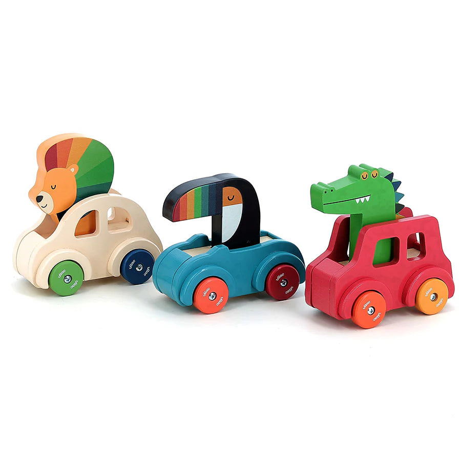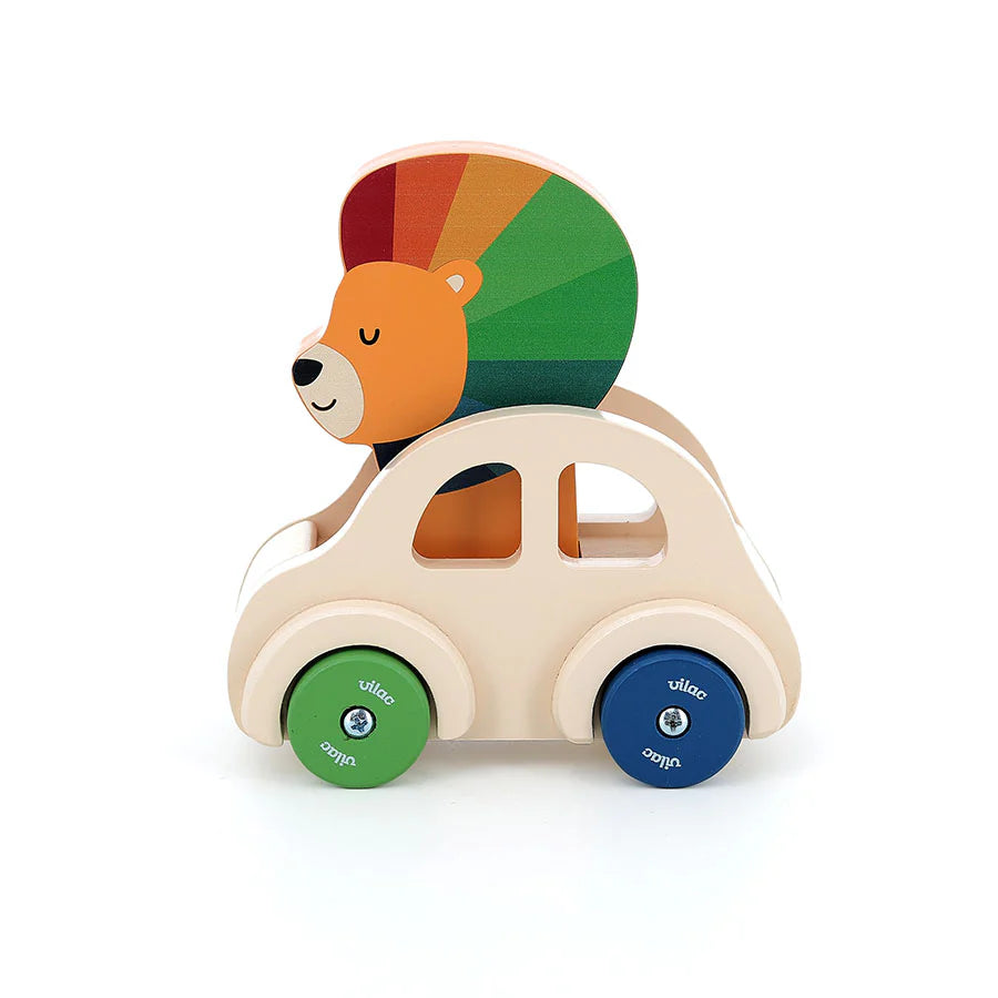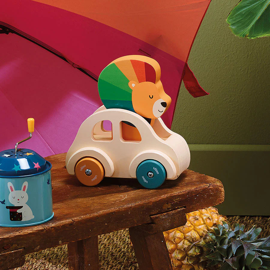 Climb aboard this round car, illustrated by Andy Westface. Fall in love with this educational toy that will help your child develop their imagination and fine motor skills. At the wheel of this racing car is an adorable lion with a colorful mane. And surprise! When your child presses the lion's head, it makes a fun "squeak squeak" sound.