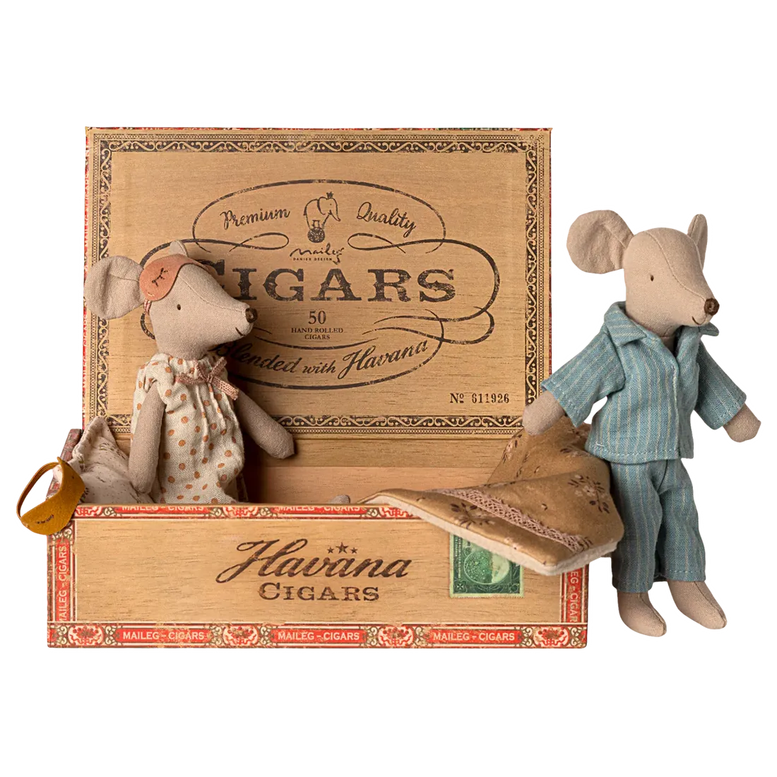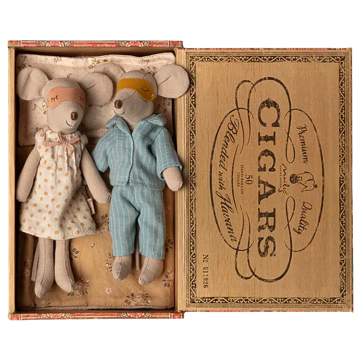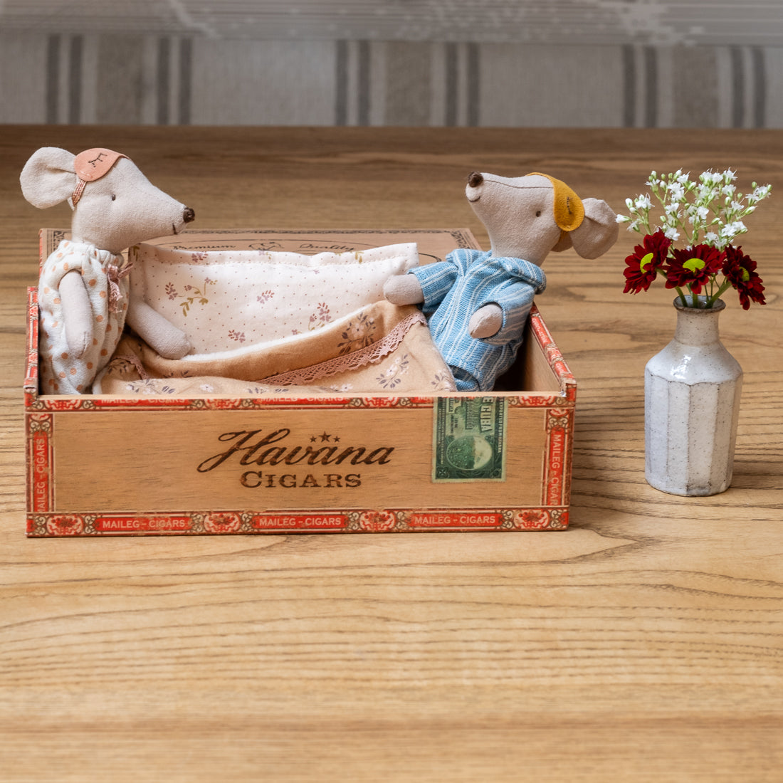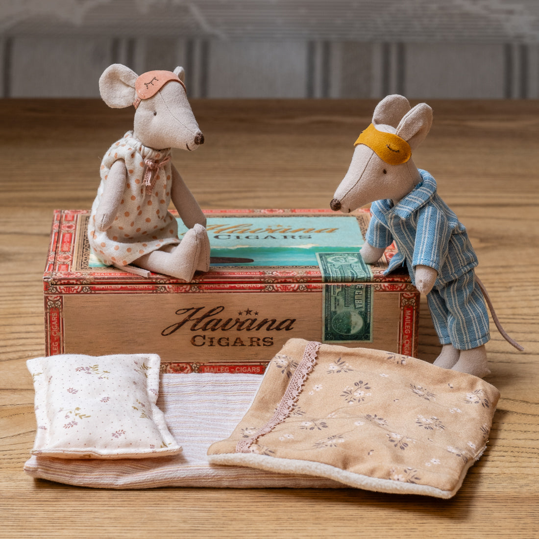 A classic Maileg item. Mum and Dad mice are wearing their beautiful nightwear and eye masks. The cigar box is a perfect bed for a good night’s sleep and sweet dreams.