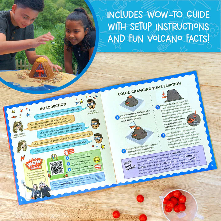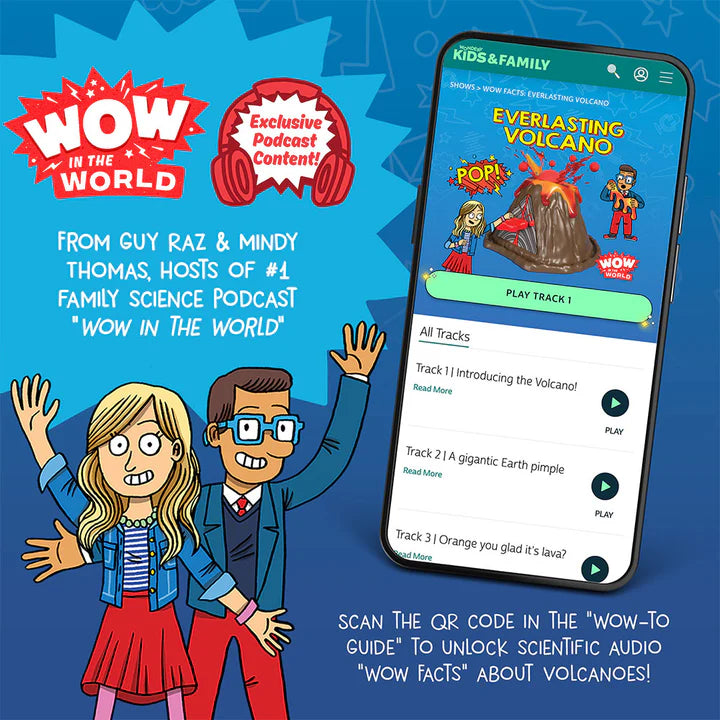 A fun, 8-page, full-color experiment manual guides you through using your volcano and provides fun, educational content about volcanoes. Scan the QR code to access exclusive audio content from Wow in the World’s Guy Raz and Mindy Thomas as they explain the science behind each eruption, reveal fun facts about volcanoes, and even share volcano sounds!