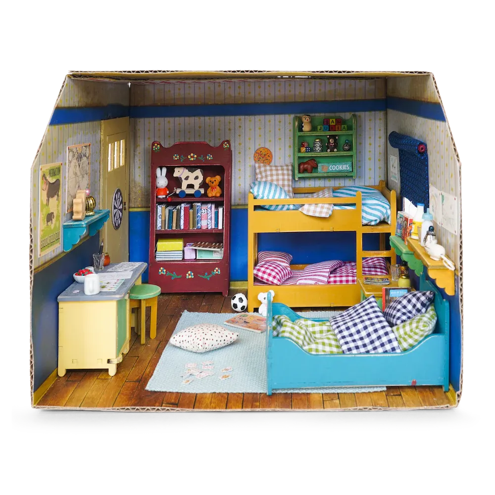 Create a mini kids' bedroom with this furniture kit! The pre-cut wooden pieces can be easily assembled with simple instructions and are 1:12 scale. Based on the Mouse Mansion book series by Karina Schaapman, the kit lets you bring the charming world of Sam and Julia to life. This furniture kit includes a miniature bunkbed, a single bed, nightstand, a desk, a stool, bookshelves, and a cabinet. Paint, glue, and accessories are sold separately.