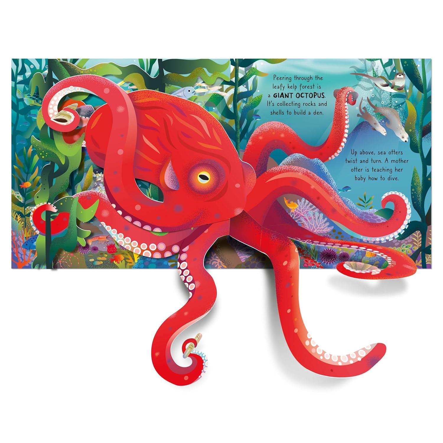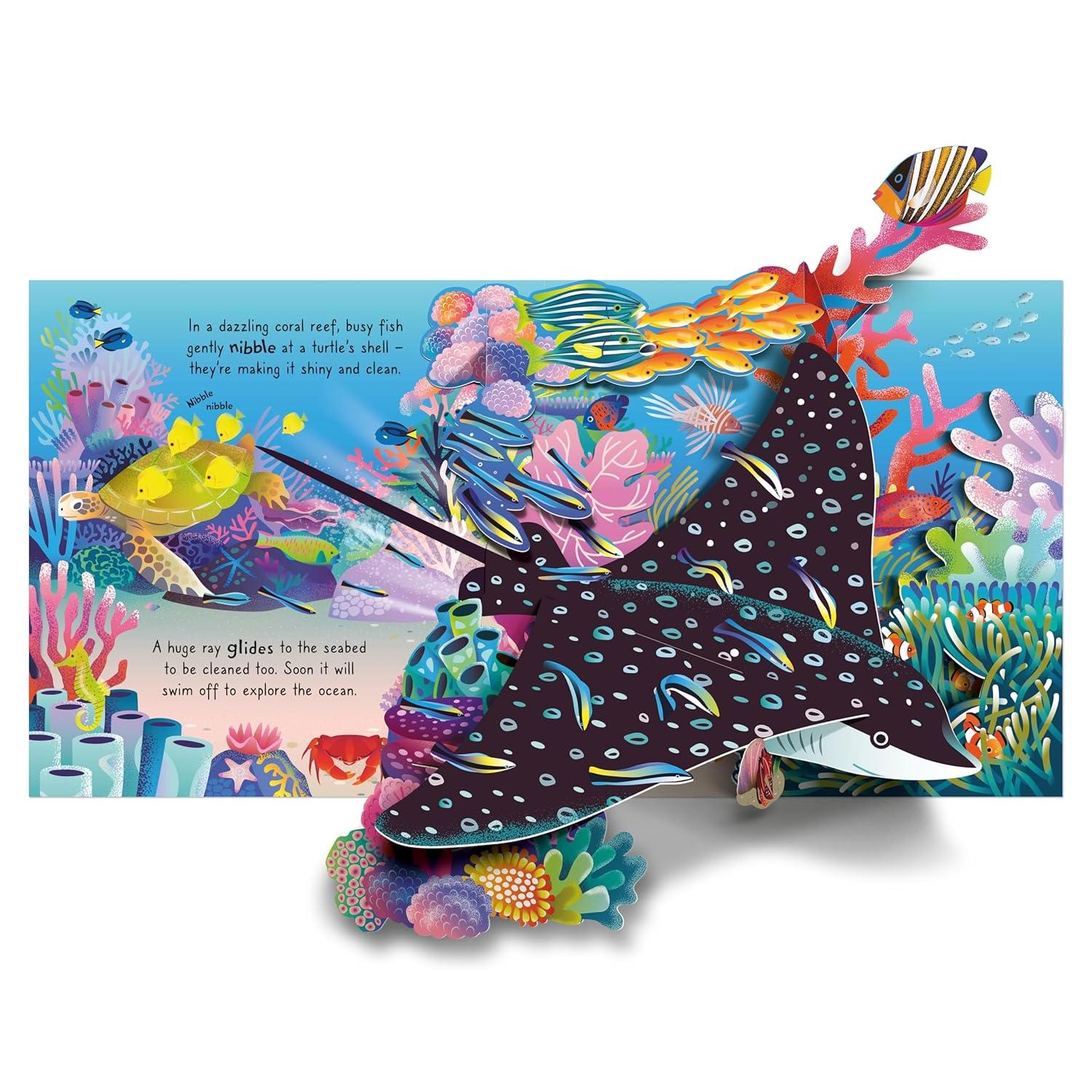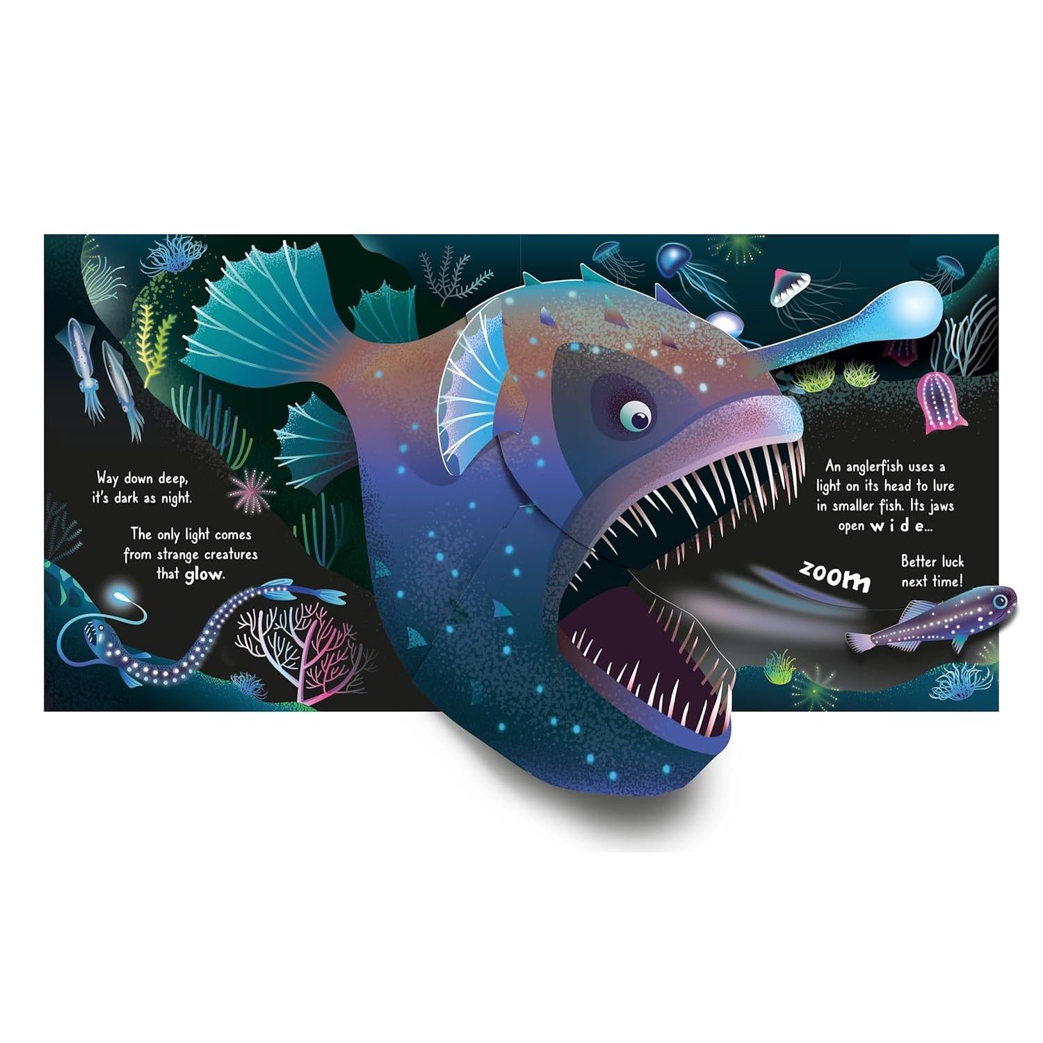 Meet a ray and a turtle gliding through a teeming coral reef, spot an octopus hiding in the kelp forest and a shark dashing after a shoal of shimmering sardines. Dare to explore the dark deep where a glowing anglerfish lurks, before meeting a huge blue whale as it rises to the surface. With five fantastic pop ups, this book will take you on an awe-inspiring journey to the depths of the ocean and back again.