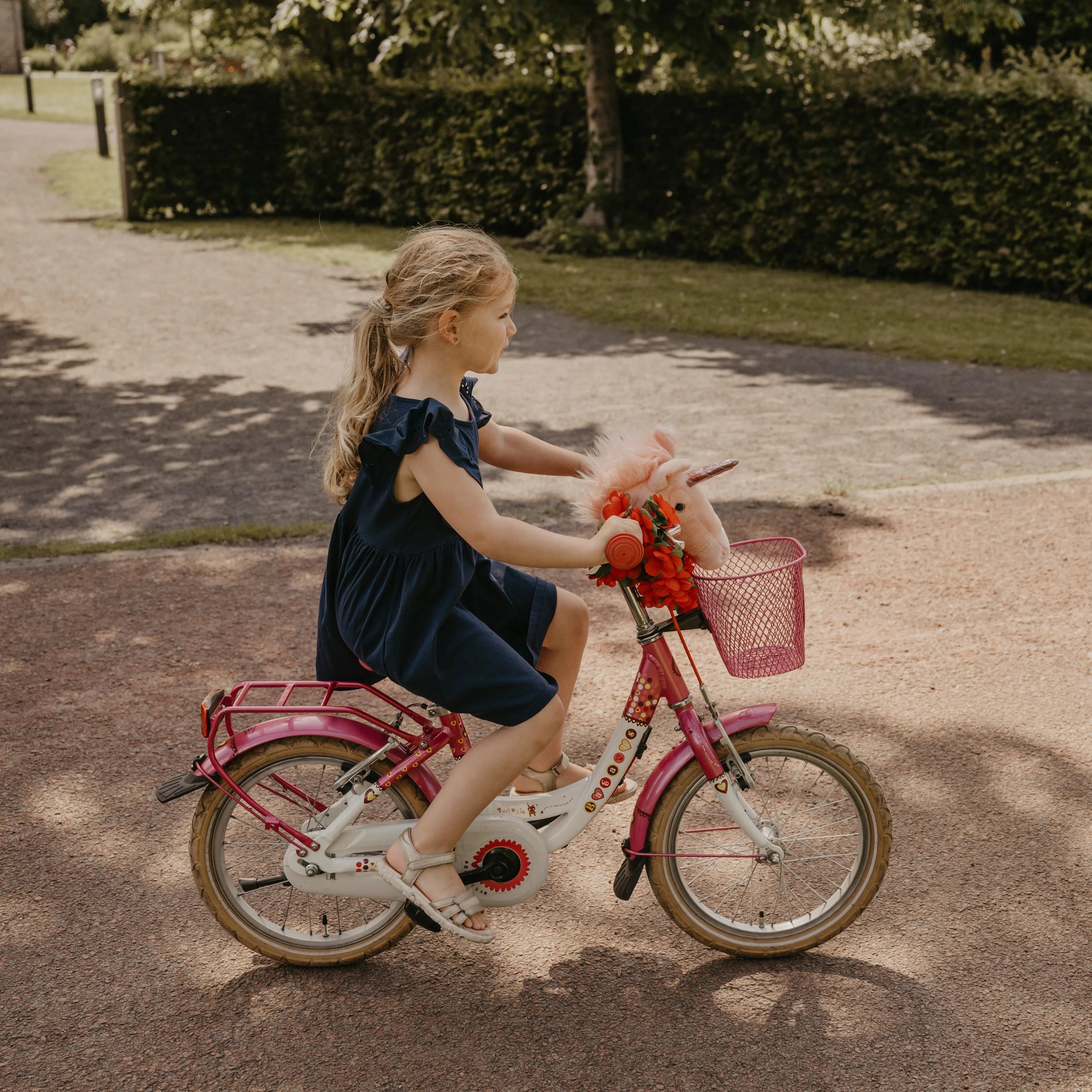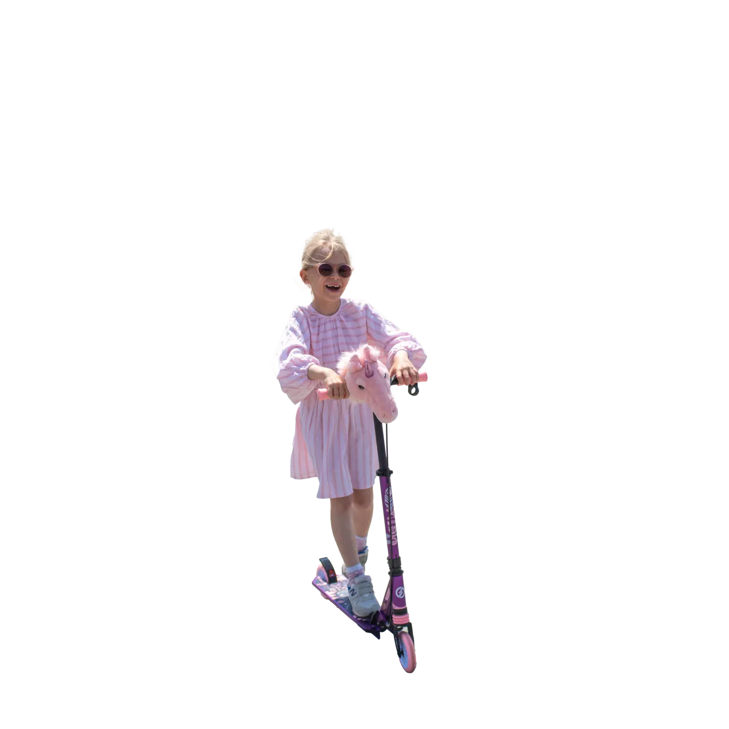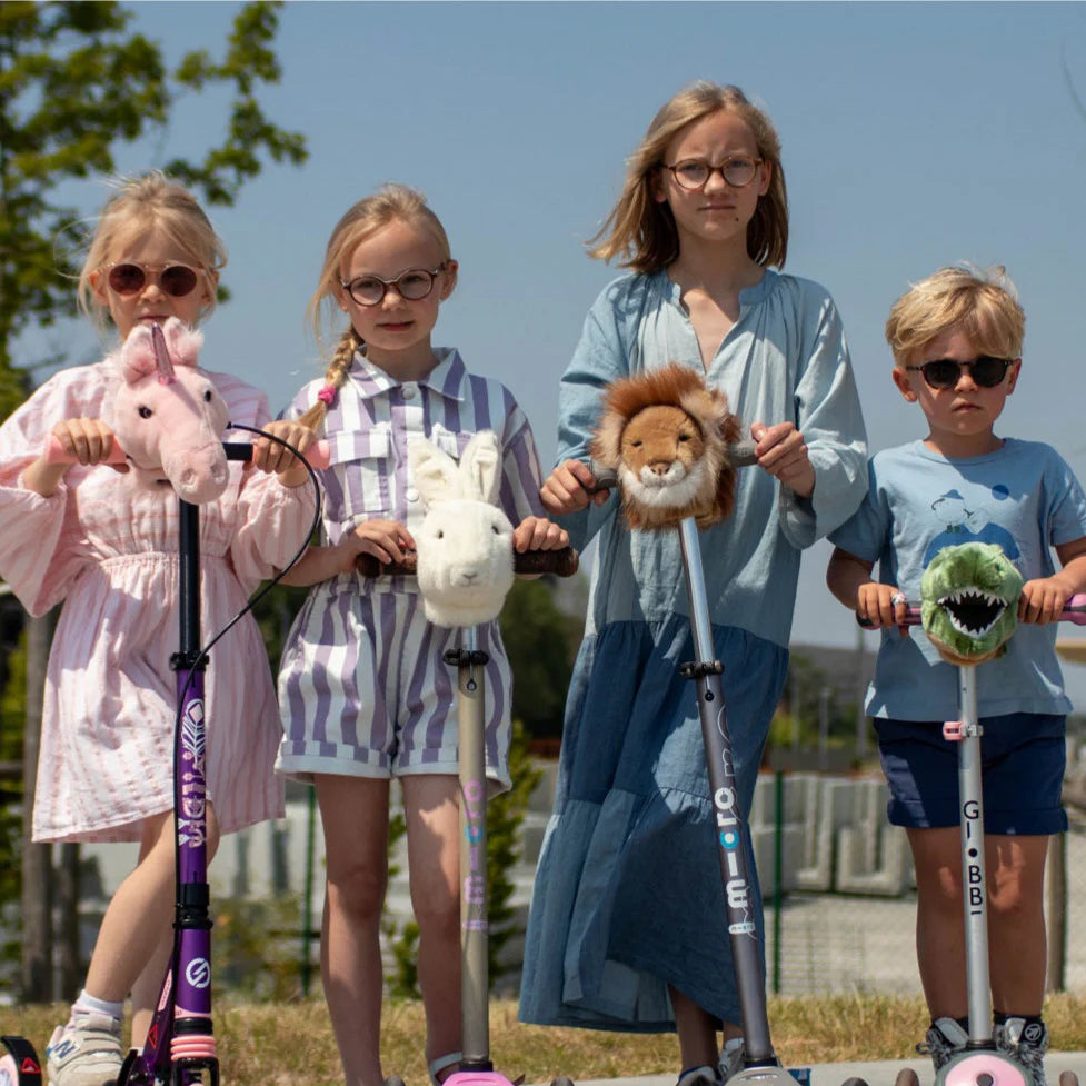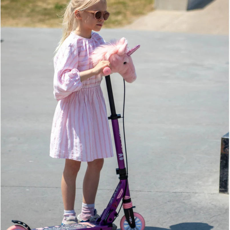 Turn your scooter or bike into a real friend with this fun animal head for the handlebars. This little pink unicorn would love to go out with you! These super soft heads can easily be applied with velcro to your handlebars.