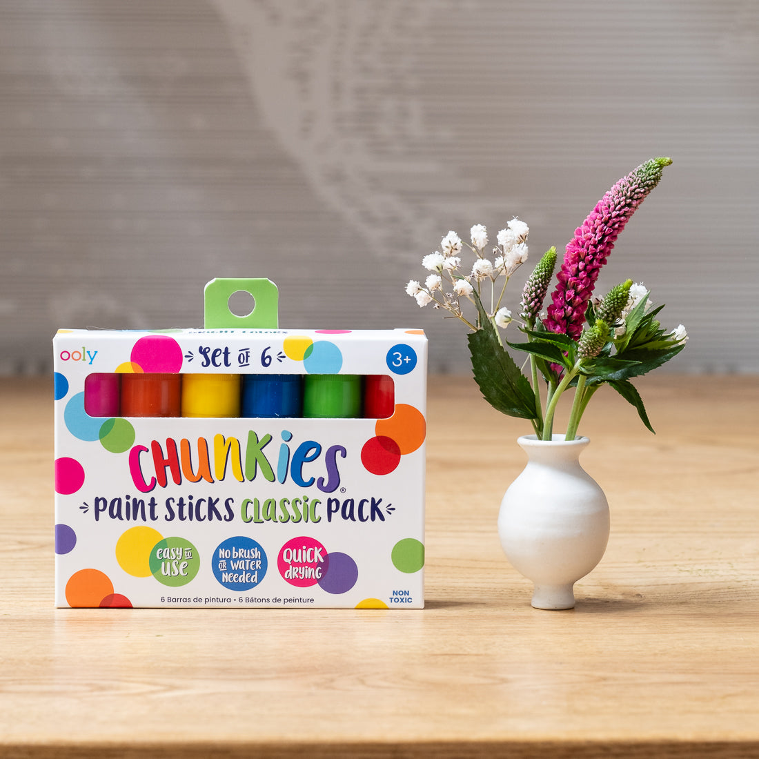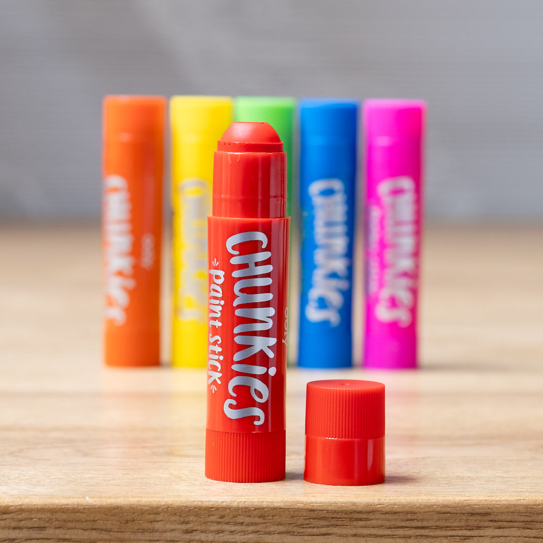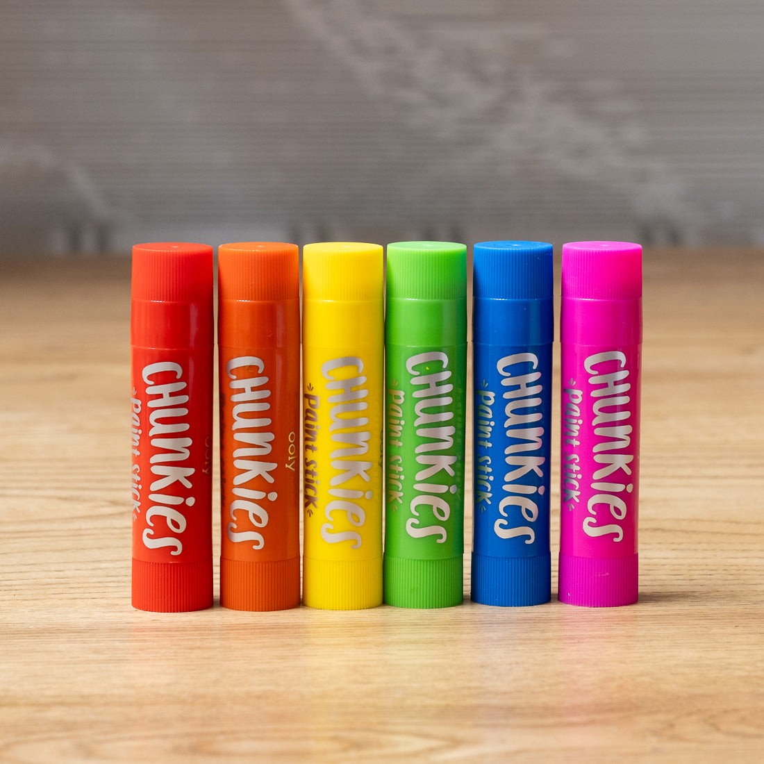 When you want to paint colourful pictures but want to leave the mess behind then it's time to reach for Chunkies Paint Sticks. Chunkies are super easy to use, clean and portable because they're like painting with a crayon. Just uncap, twist and start painting. Chunkies comes in a set of 6 different coloured paint sticks each in a thick barreled casing so they're easy for little hands to hold. The paint colors are quick drying and won't smudge, but it's easy to mix colours to make even more colours. It's magic! Care and use recommendations: Keep capped when not in use, to help prevent drying. Cover and protect your workspace. This product may stain some surfaces.