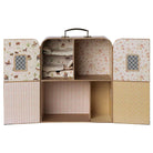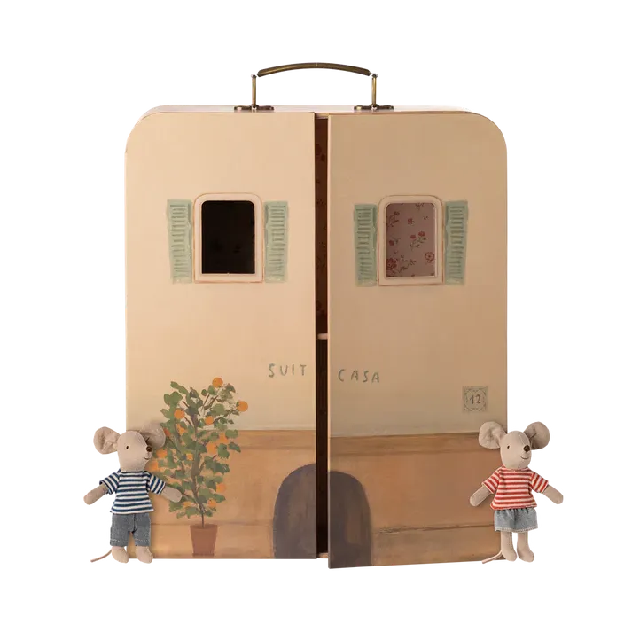 Welcome to SuitCasa - a small portable house. It fits the size: Little brother and sister mice. 2 sets of soft bedding for your friends are included but you can buy several of other small furniture to decorate the house.