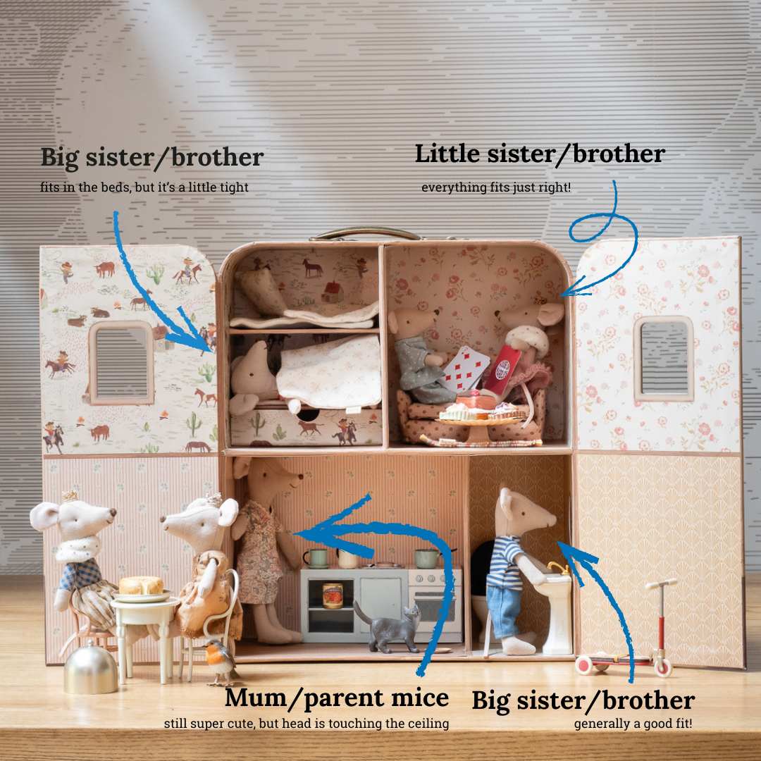 The SuitCasa is designed for the little sister and brother scale mice, but we know you want to know what it looks like with other sized mice. Please see the labeled photos to see what big brother and sister mice as well as parent mice look like in the house.