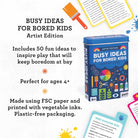 Out of ideas for how to interest bored kids? Pick a card! This card pack in a handy flip-top tin includes 50 fun ideas to keep boredom at bay as kids make the most of inside play. Choose cards with the PAINT icon for creative ideas, HEART icon for active ideas, and the BOOK icon for quiet ideas.