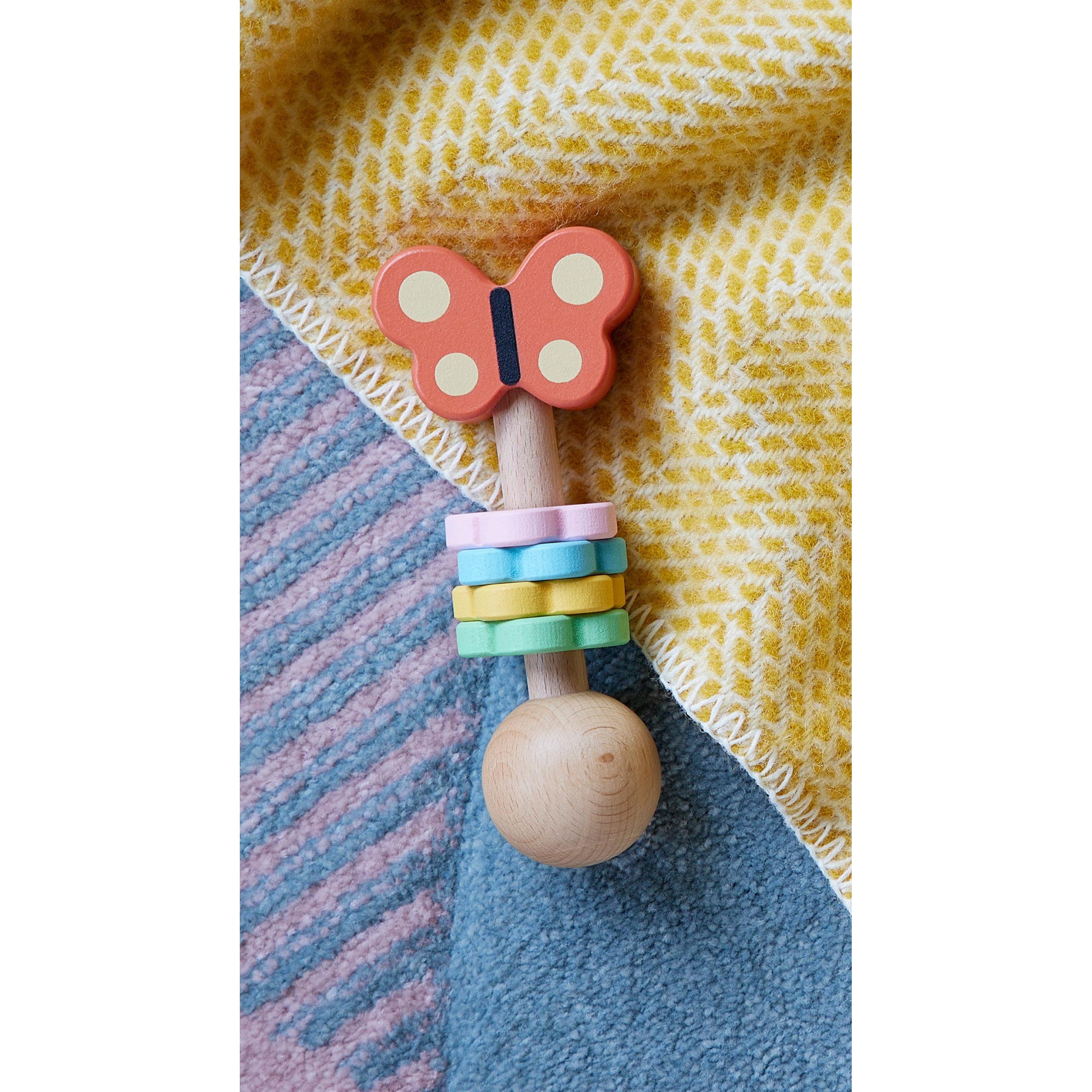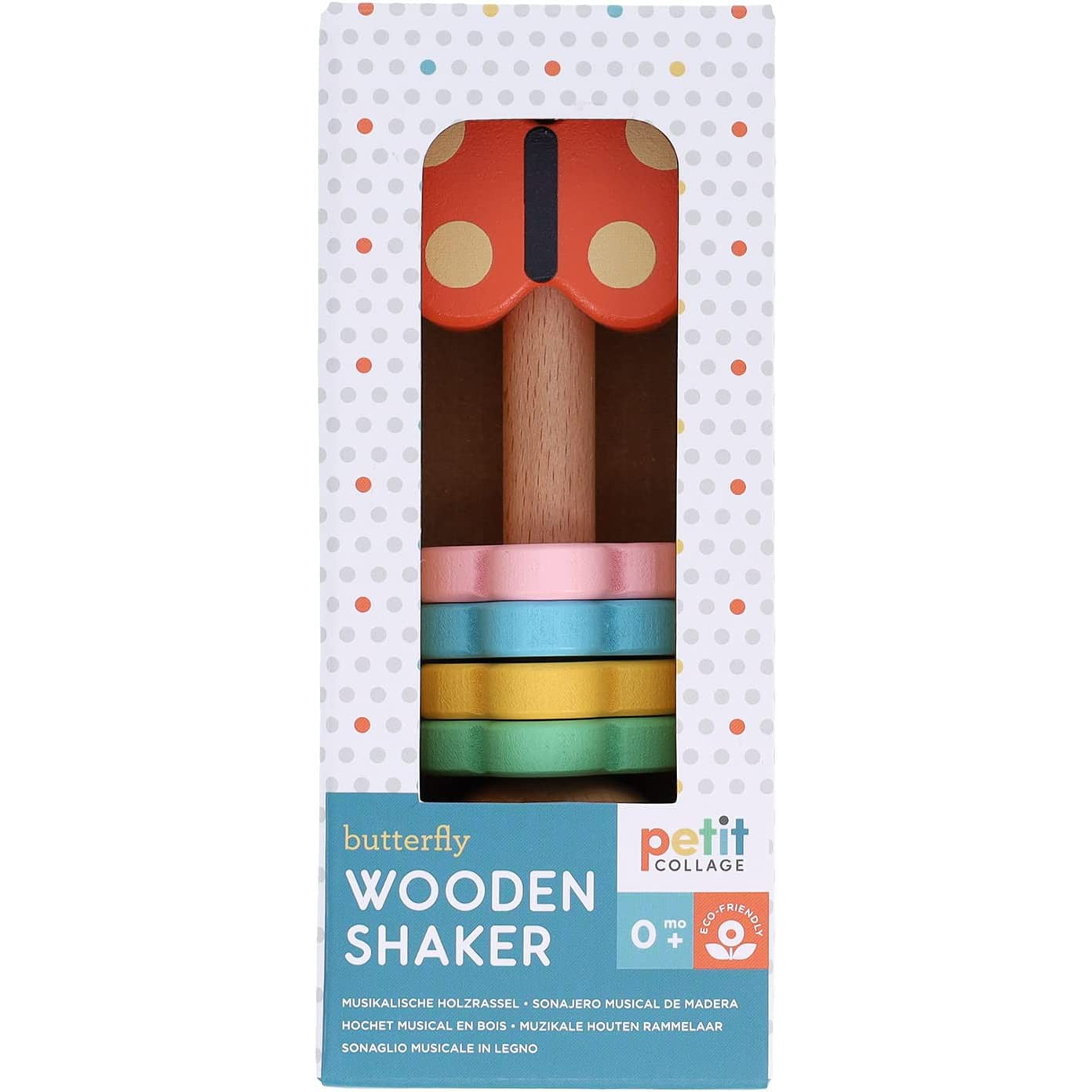 Shake and rattle your way to sensory play! This beautiful wooden butterfly shaker from Petit Collage features different coloured flower discs on a wooden rattle with a butterfly at one end. Made from FSC-certified wood and water-based paints.