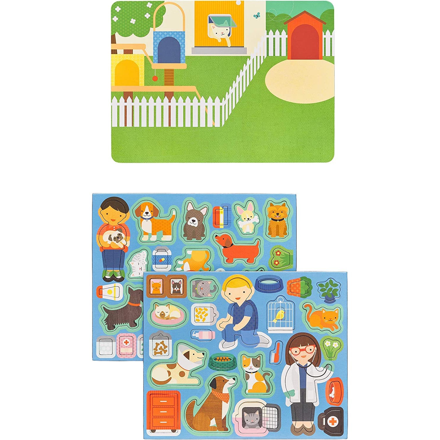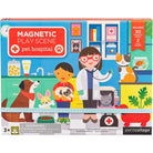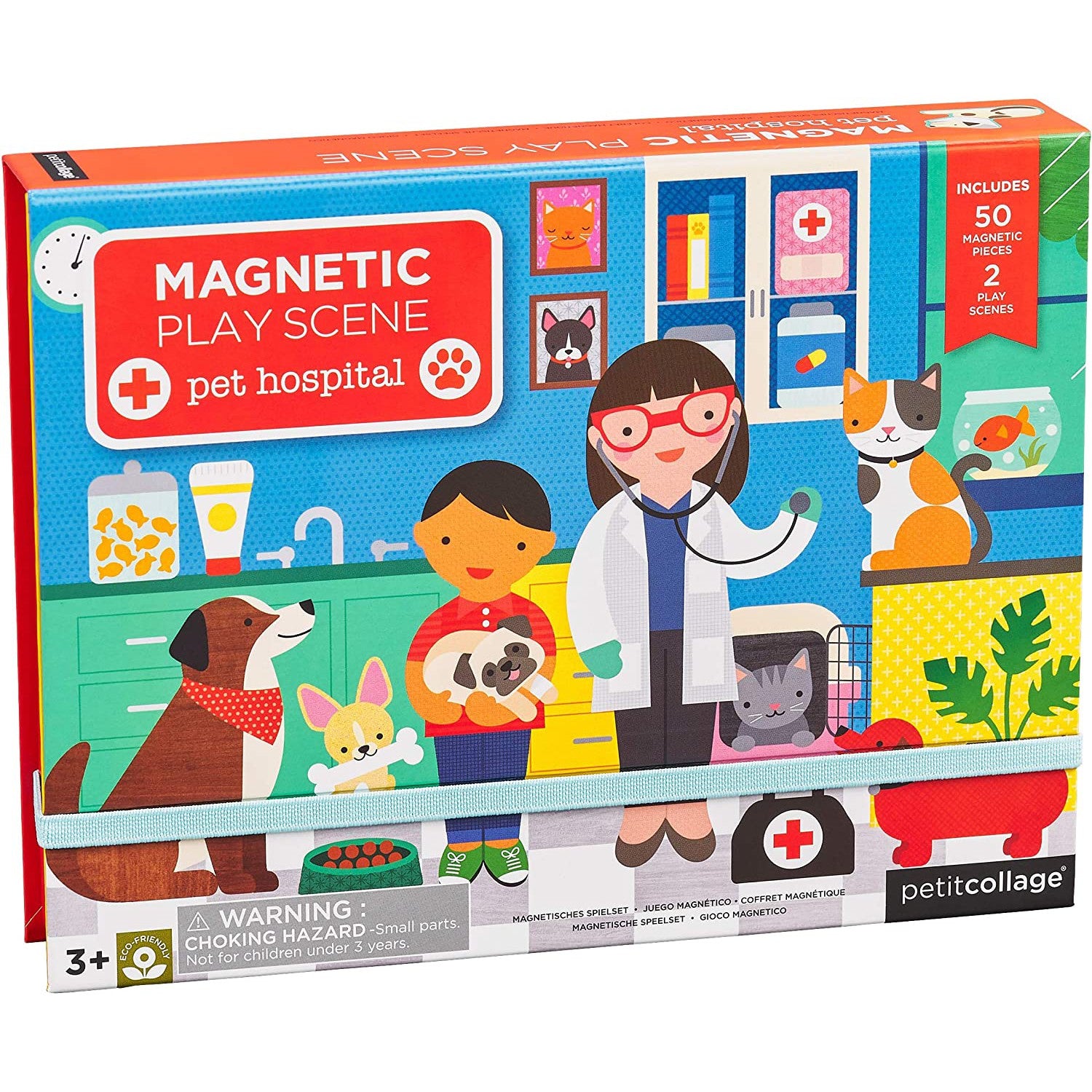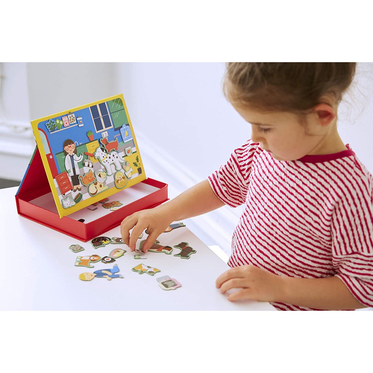 Express your creativity as you care for the cats, dogs, and birds that visit your busy veterinary practice. This fun role play activity is perfectly travel sized to bring along anywhere. The illustrated background stands on a pop-up easel for your little one to easily place the magnetic pieces as they act out scenes from their imagination.