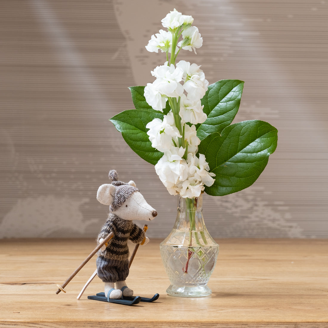 A mouse ready for hours of fun on the slopes during the cold wintertime. Each playset contains a warmly dressed mouse with a pair of ski and poles. A funny detail is the ears which are made so they look like the mouse is wearing ear warmers.
