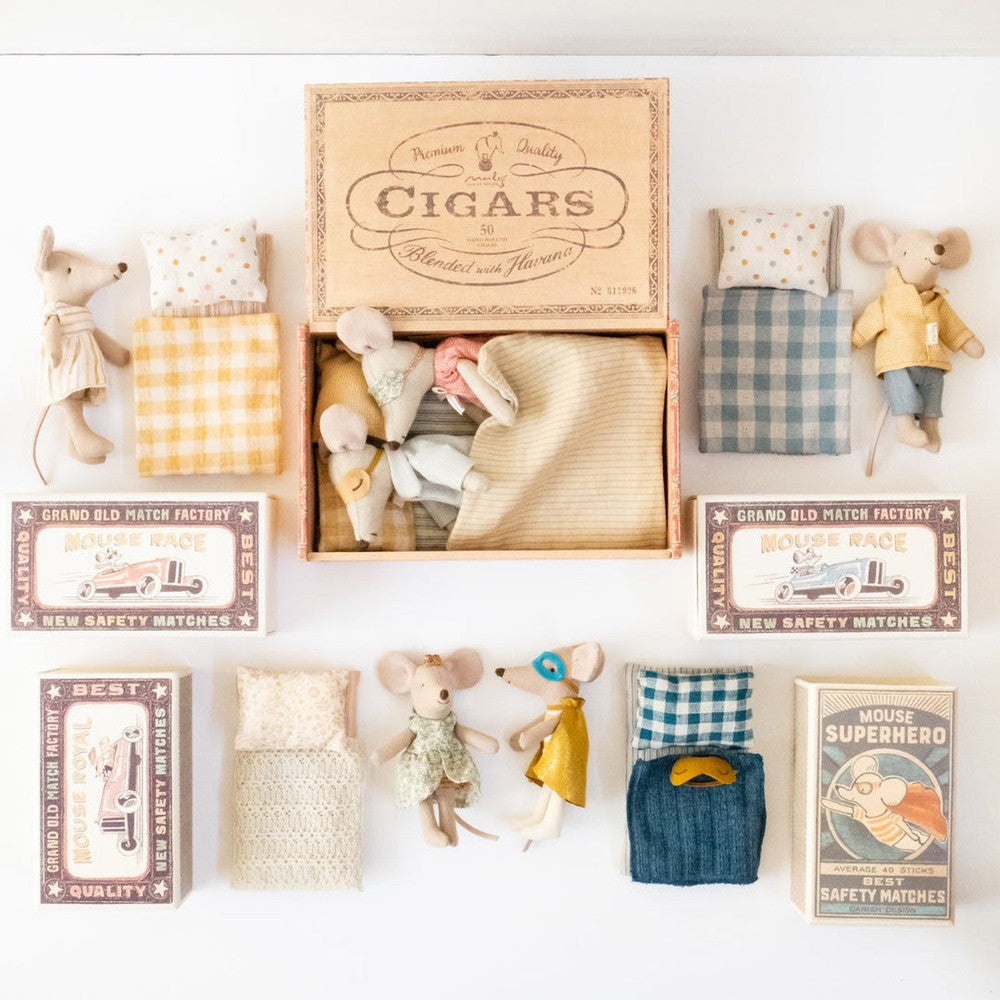 Mum and dad got some new pyjamas for 2022! Finally the little ones are all tucked in, and now its mum and dad's turn. They're all ready to go with their eye masks and cozy nightwear. The cigar box makes the perfect bed for these wee mice. Night night!