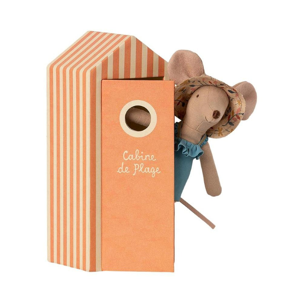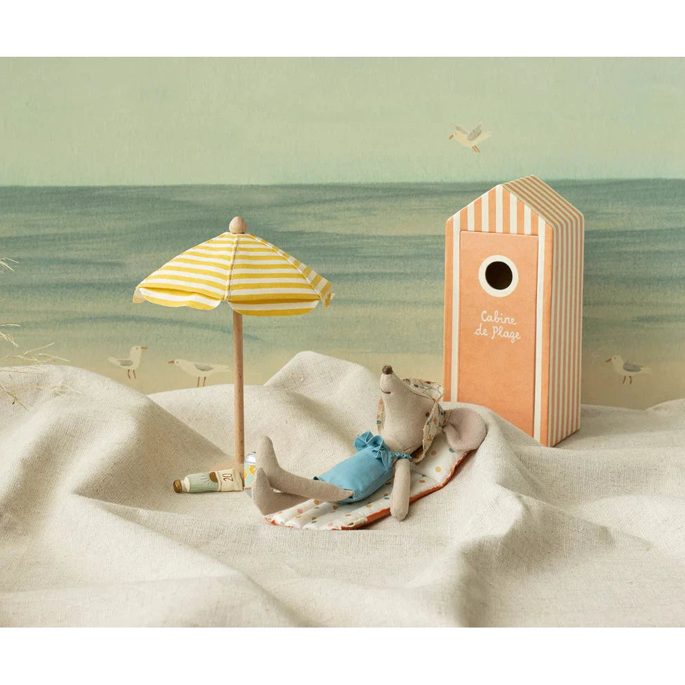 Mum's getting her toes in the sand too! Maileg does it yet again with a super cute mum mouse with sun hat and cheery bathing suit. Tuck her away in her cardboard beach cabana when she needs a break from the heat.