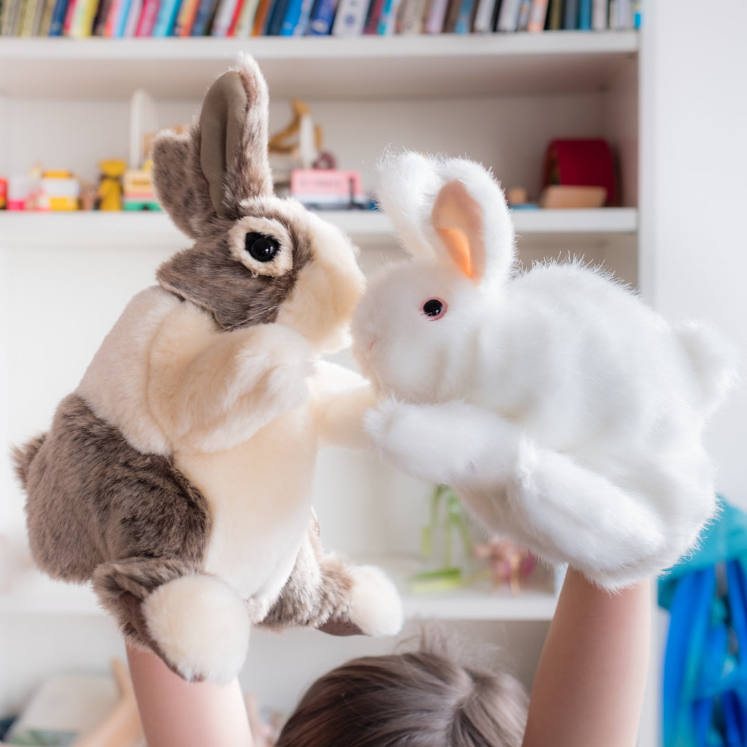 Cream and coffee coloured fur and sweet features make this huggable baby bunny a top seller. Nurturing kiddos love to cuddle and create fanciful forest adventures for this rabbit. Babies go bananas for this puppet - watching parents amaze their little ones with this bunny is one of our very favourite things to watch in the store.
