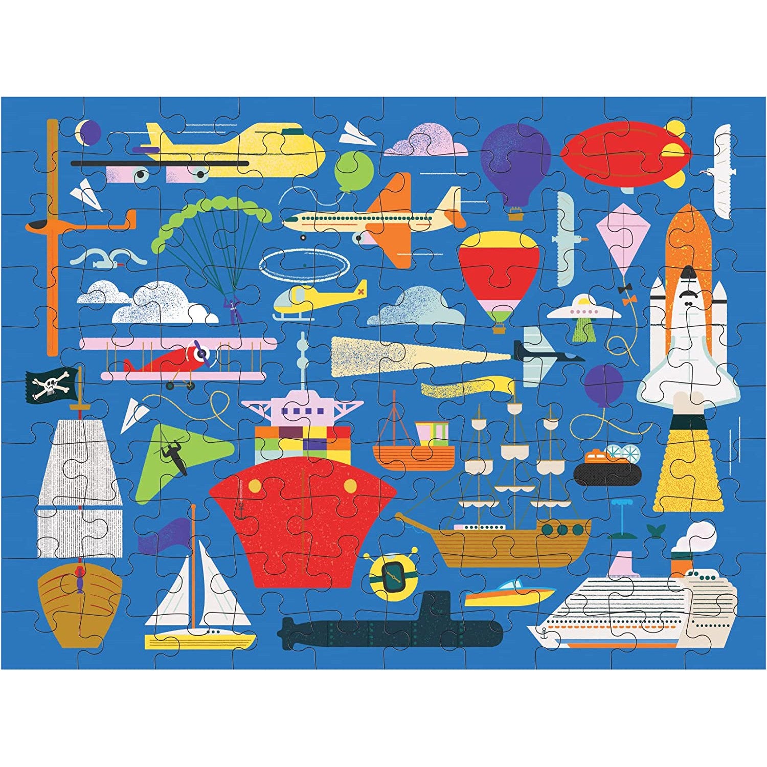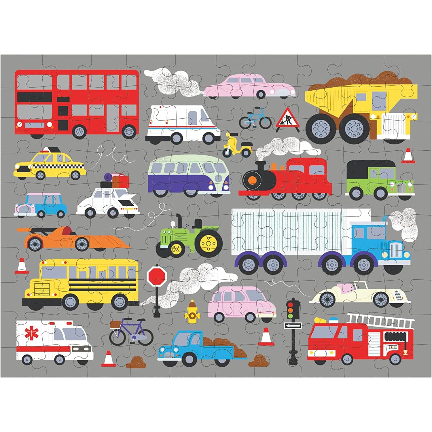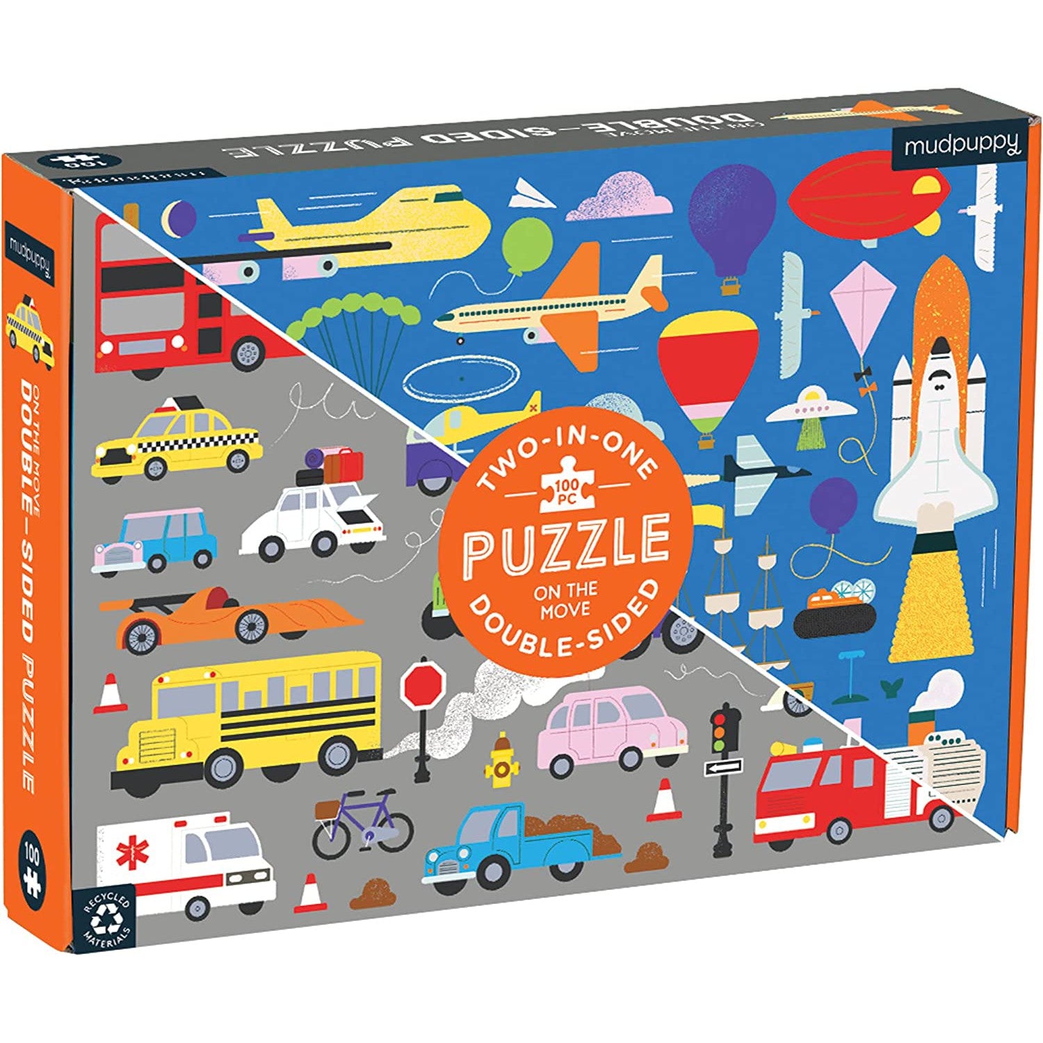 Mudpuppy's On the Move 100 Piece Double-Sided Puzzle features fun illustrations of colourful transportation vehicles, cars and trucks on one side and airplanes and space shuttles on the other. This two-in-one puzzle is a great family activity for adults and children to enjoy together. Puzzle pieces come packaged in a sturdy and easy-to-wrap box, perfect for gifting, reuse, and storage.