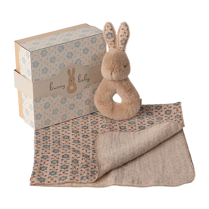 A perfect gift idea for the little ones. The set includes a soft cotton cloth and a small rabbit rattle. The rabbit has a small rattle inside that makes a soft sound. It all comes in a beautiful gift box.
