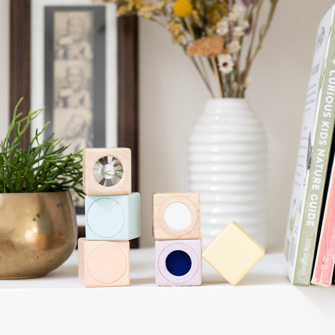 Perfect for explorative babies, the Sensory Blocks from Plan Toys provide sound, sight, and touch stimulation. Includes 2 visual blocks, 2 noise blocks, and 2 texture blocks. Identical in shape, these pretty pastel blocks are also easy to stack up and knock down. A great early learning set for your baby.