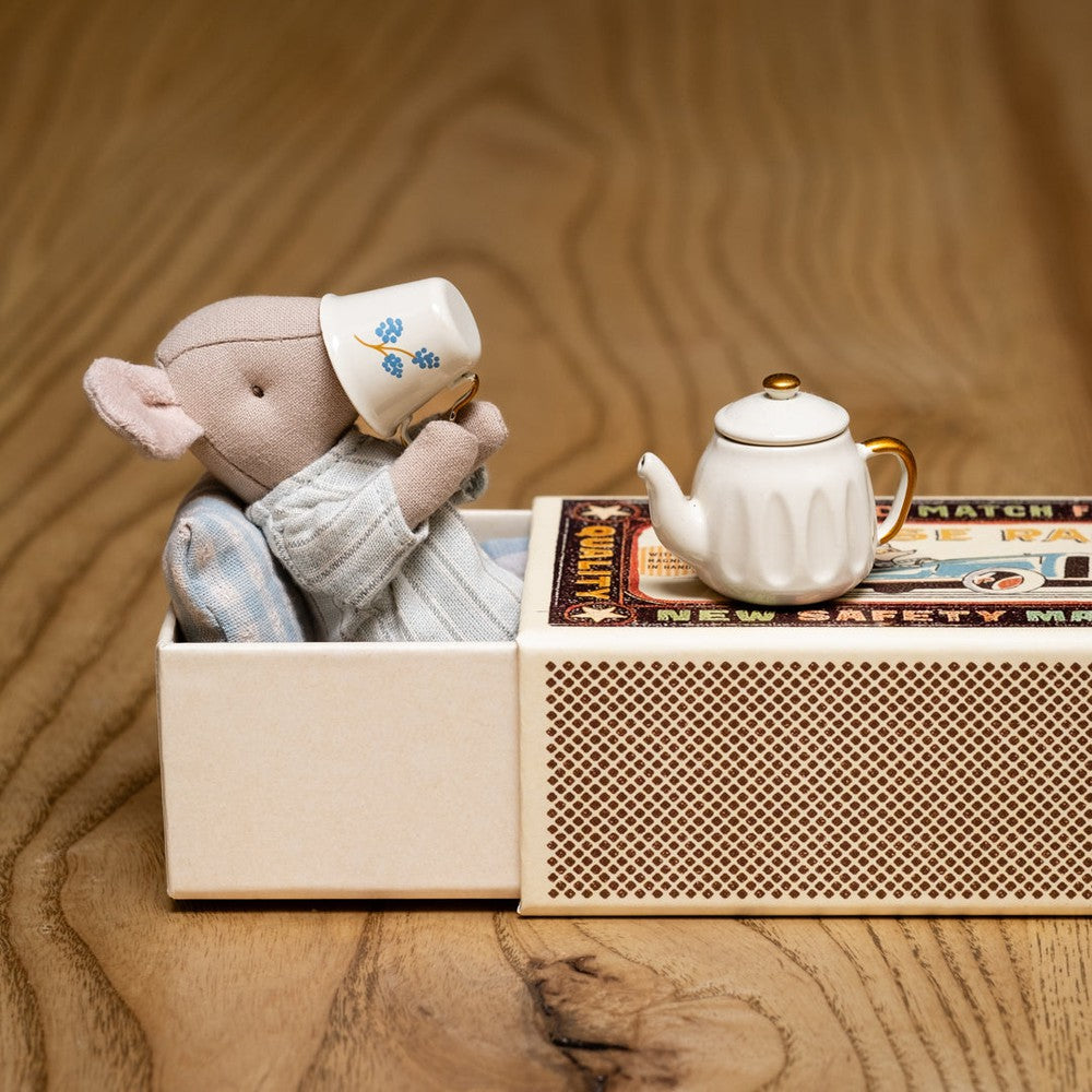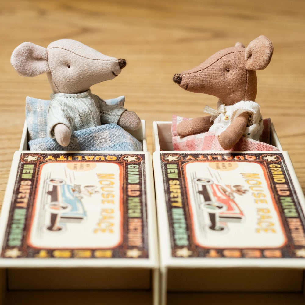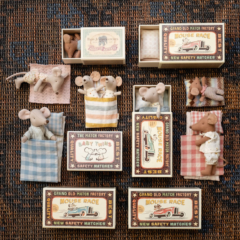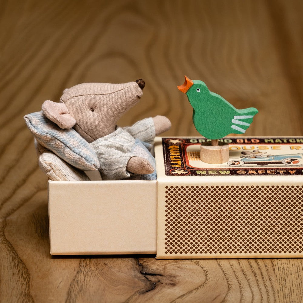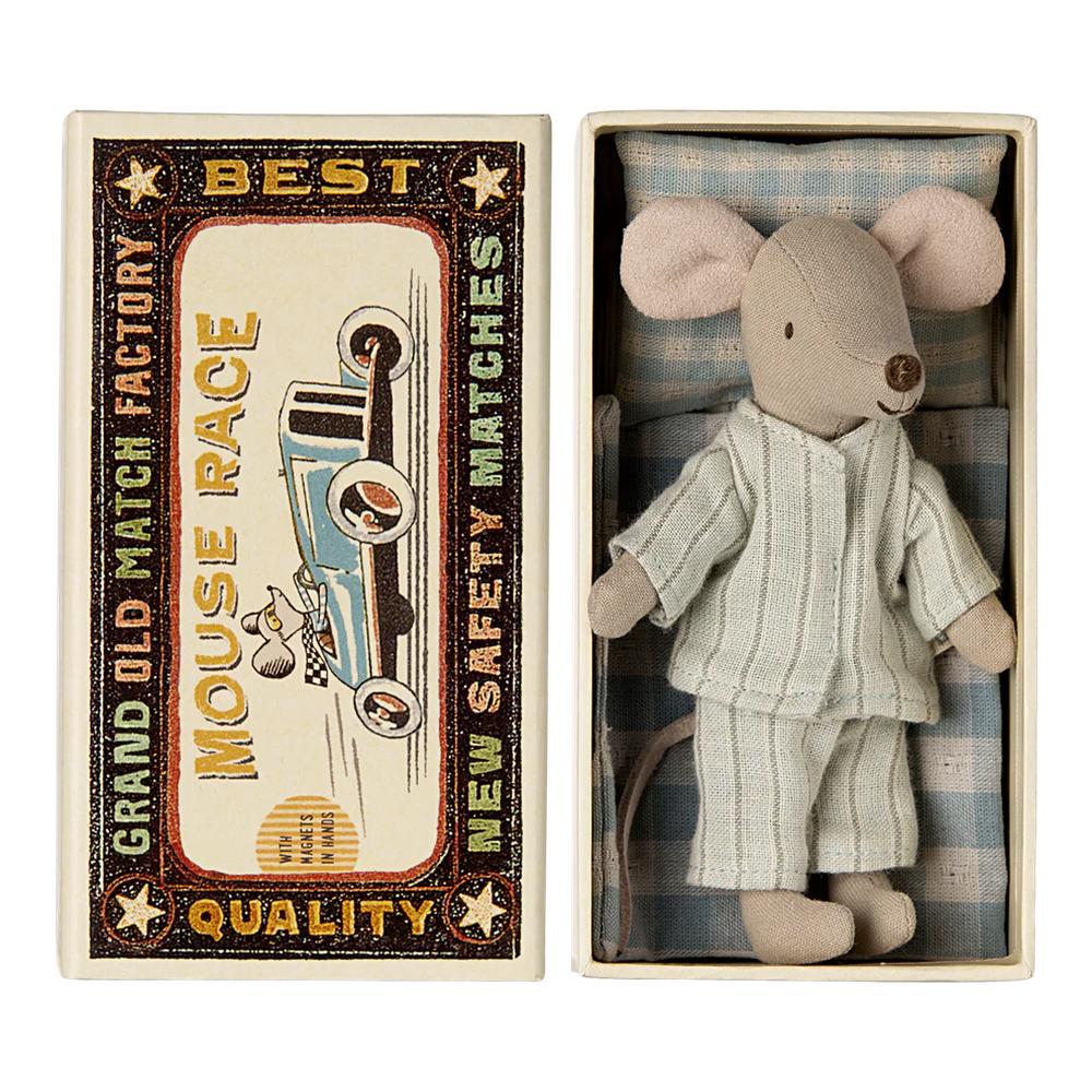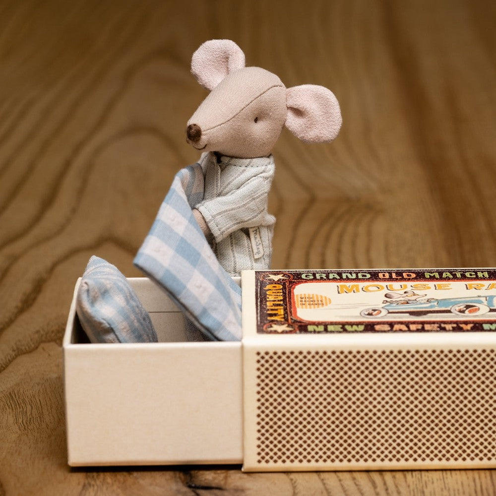 A classic Maileg item. This mouse is ready for hours of play and sleeps tight in the little matchbox. The clothes and bedlinen are made of soft fabrics with unique prints in beautiful colours. Extend the story by adding accessories to the play