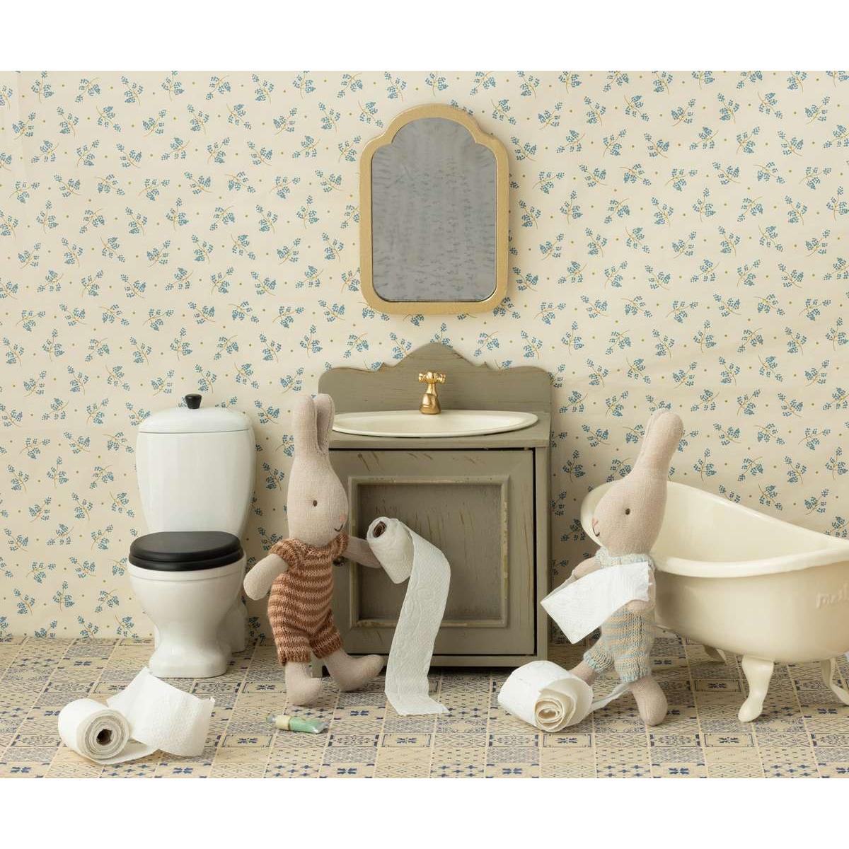 A toilet is added to the bathroom assortment. It is beautifully made in an off-white color with a black seat. Seat can open and close, and a pull function in the handle makes it very real and playful. Fitted for size 1, 2 and Teddy family.
