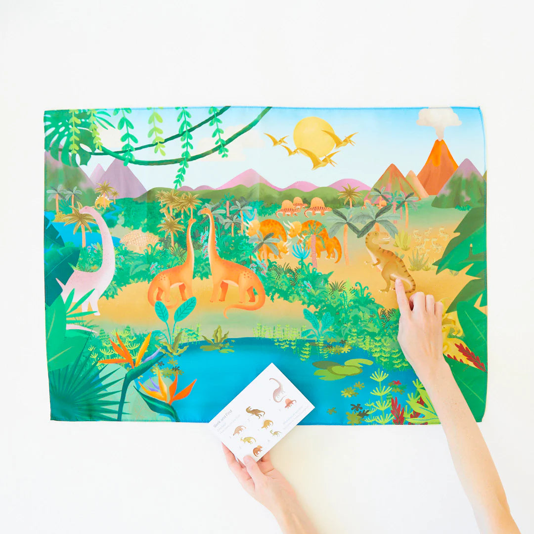 Seek & Find Playsilks are made in collaboration with different artists. The Dinosaurland Seek & Find features artwork by Hayley Cunningham, you can find her on Instagram @kidofthevillage