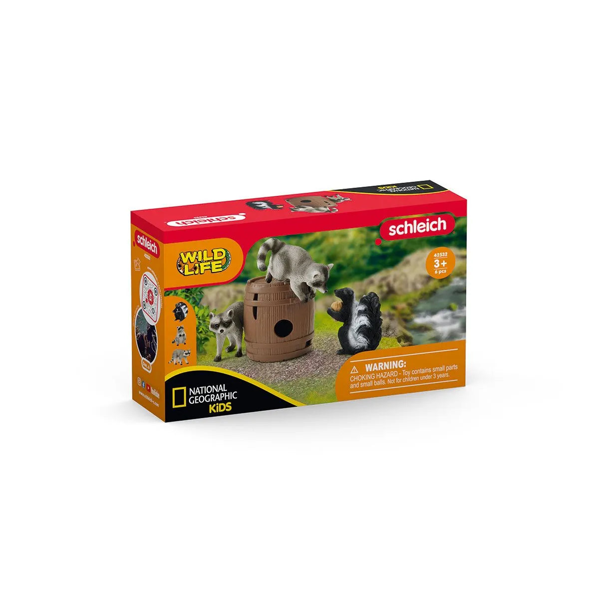 The Nutty Mischief playset from schleich® features your favourite woodland critters in a playful game of keep away. Included with the Nutty Mischief playset are two crafty raccoon figurines, an adorable skunk figurine, plus a barrel and plastic walnut accessory. The clever skunk tosses the walnut in the wooden barrel to hide it from the raccoons. But, oh no! One of the cheeky raccoons is in the barrel! Will the skunk be able to get the nut back?