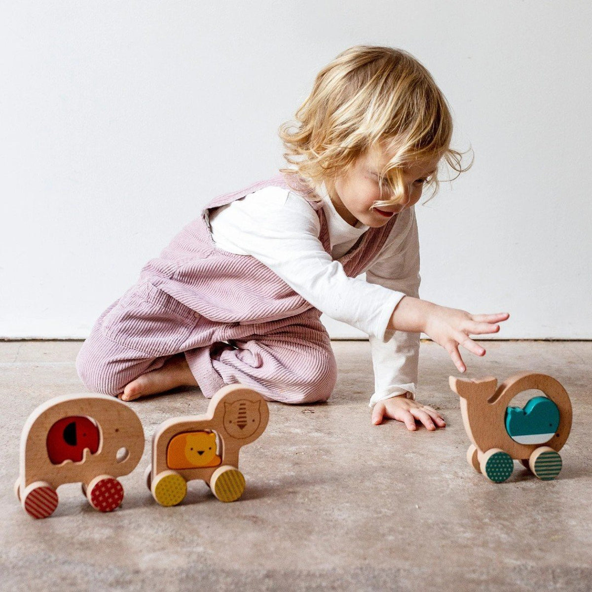 These fun wheeled animal toys are perfect for little ones to push along the ground as they get more comfortable with grasping and balancing. Made from solid beech wood, the push along animals have smooth wheels and easy to grasp designs. Comes with an adorable baby lion to nest in the parent lion.