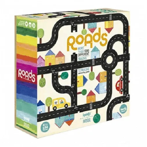 Roads game Made in Barcelona by Londji : Imagine the longest road in the world. Do you dare to build it? To overcome the challenge you will have to use all the pieces! First you build it and then you can use it to play with cars!