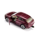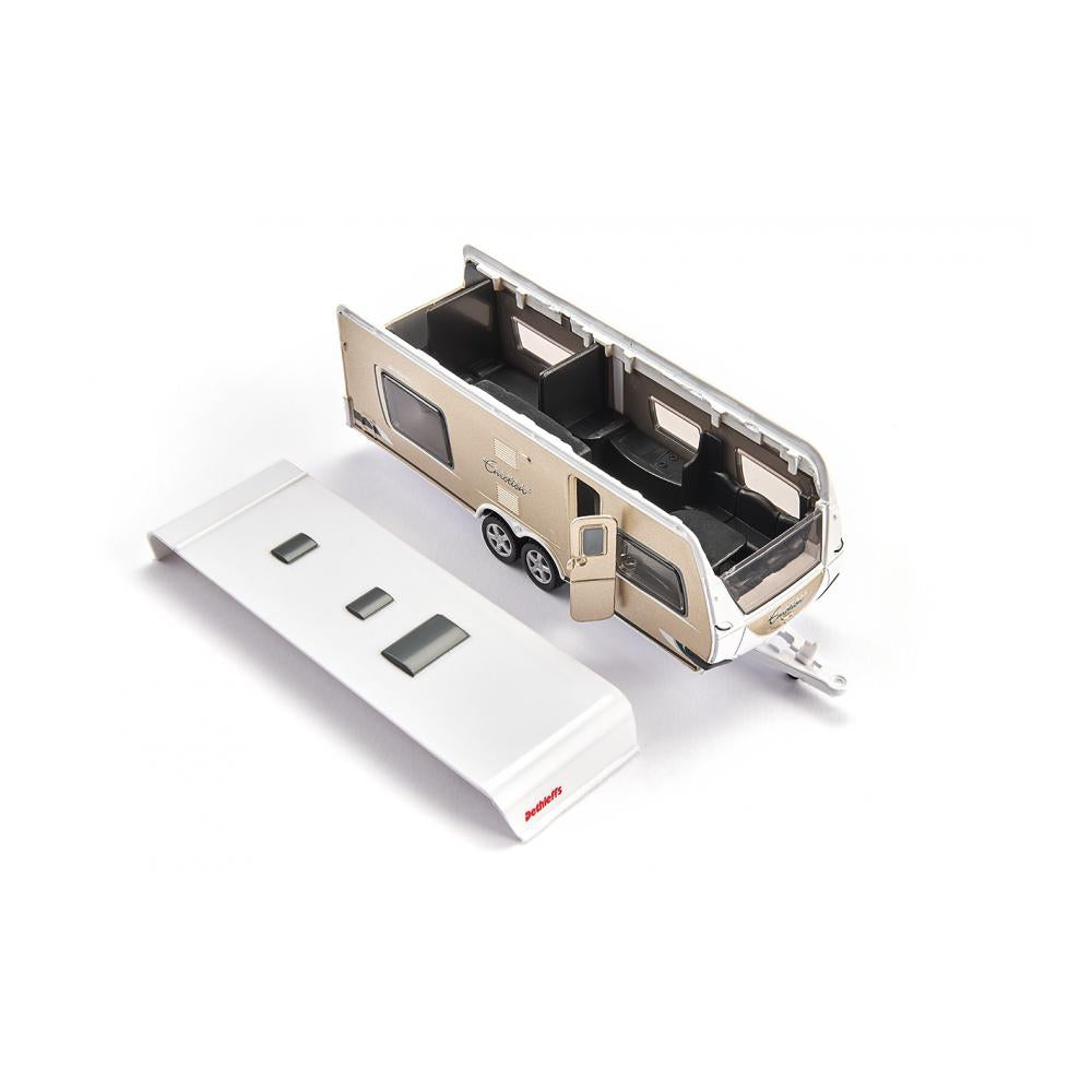 Combination with a Porsche Macan Turbo as towing car, with Dethleff's Exclusive Emotion caravan and numerous accessories. The removable roof is one of the caravan's special features — this means the figures supplied with the set can be used for hours of play inside the caravan. In addition to various figures, an almost complete camping set is included, with 2 garden chairs, table, sunshade, sun lounger, hammock and grill.