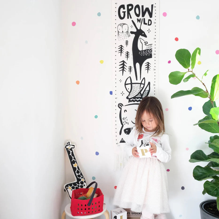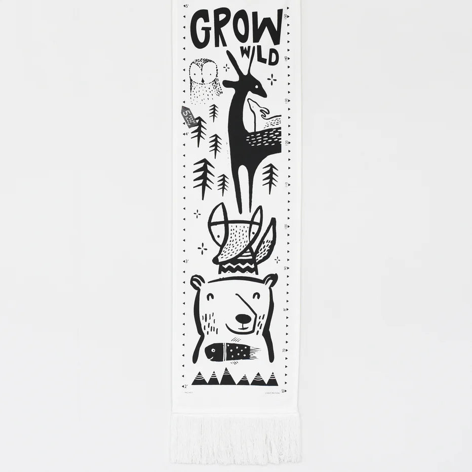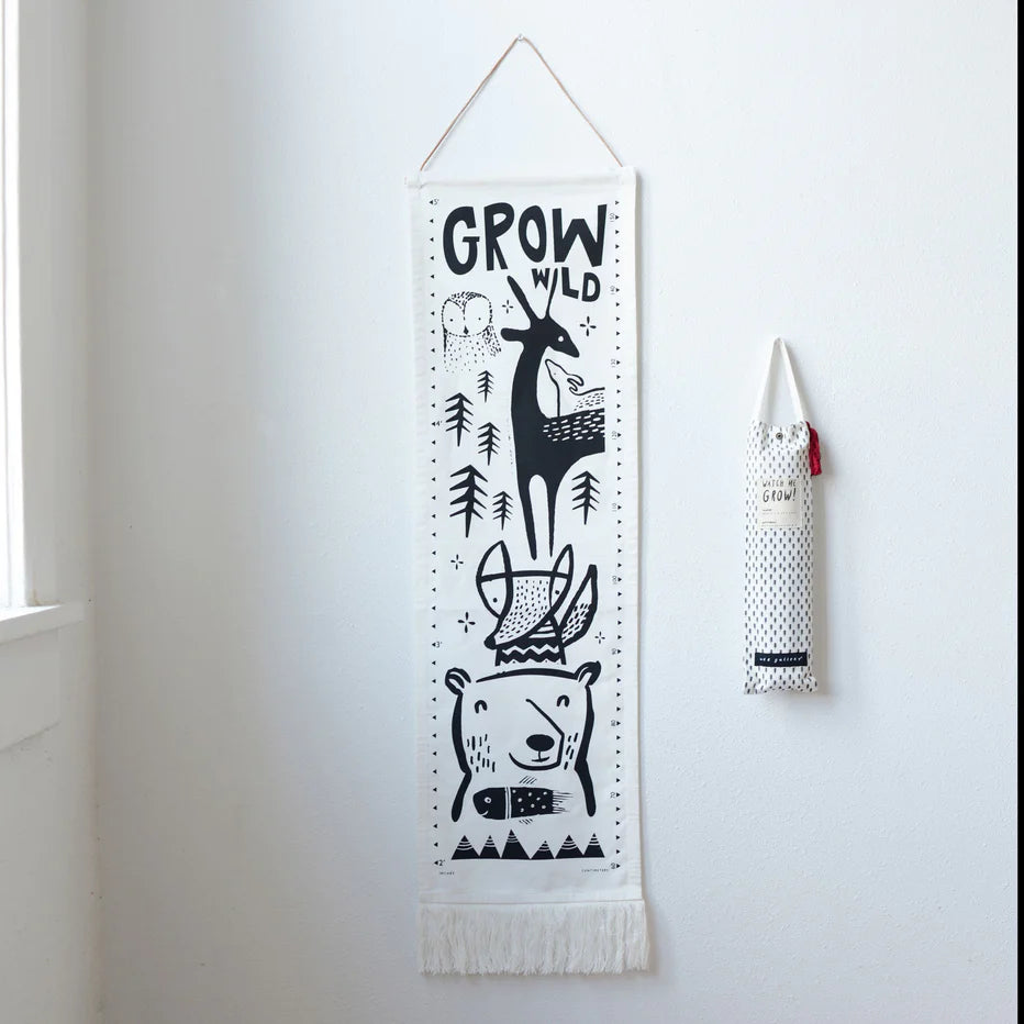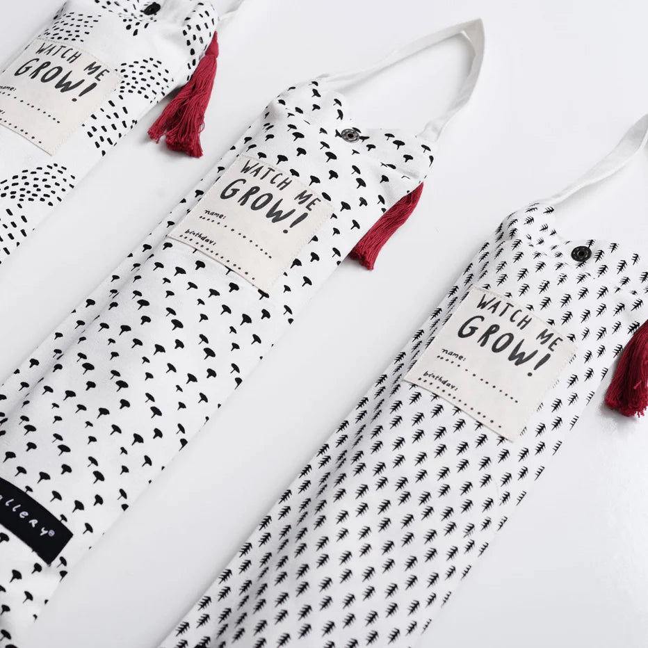 This growth chart features sweet animal faces that smile as your little one grows. Ethically and sustainably made in India using screen printing on organic cotton canvas, finished with a leather hanging cord and stylish fringe end. Comes in a special keepsake bag with a place for your child's name and birth date. Measures 44x13 inches.