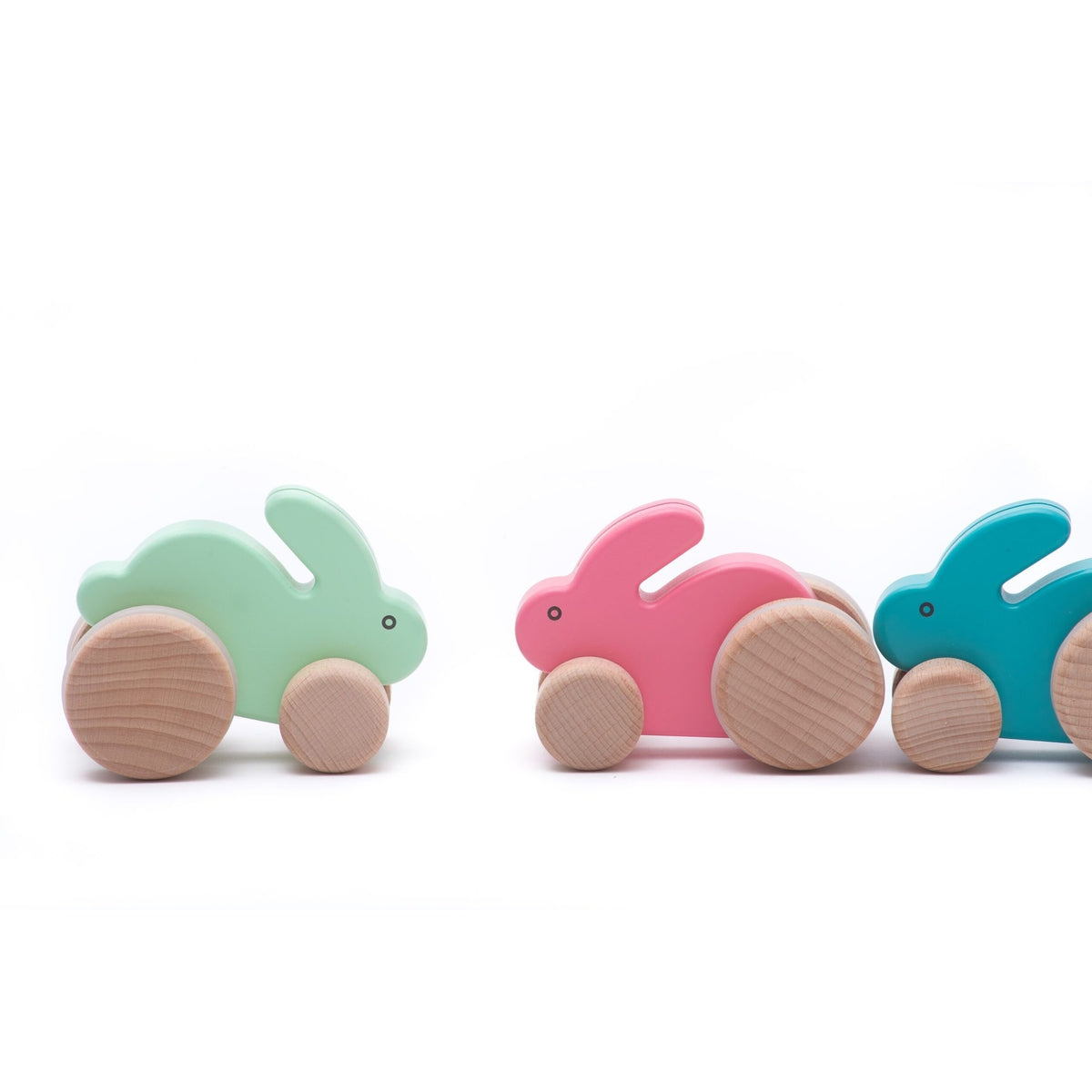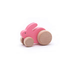 Hoppity hopping along! This scrumptious little bunny rabbit has natural wooden wheels that make it look like it is bouncing up and down as it goes. Made from sustainably-harvested hardwoods for hours and years of play, just push it along and watch it hop hop hop! In springy bright pink, this bunny is perfect for getting spring babies up and crawling and walking.