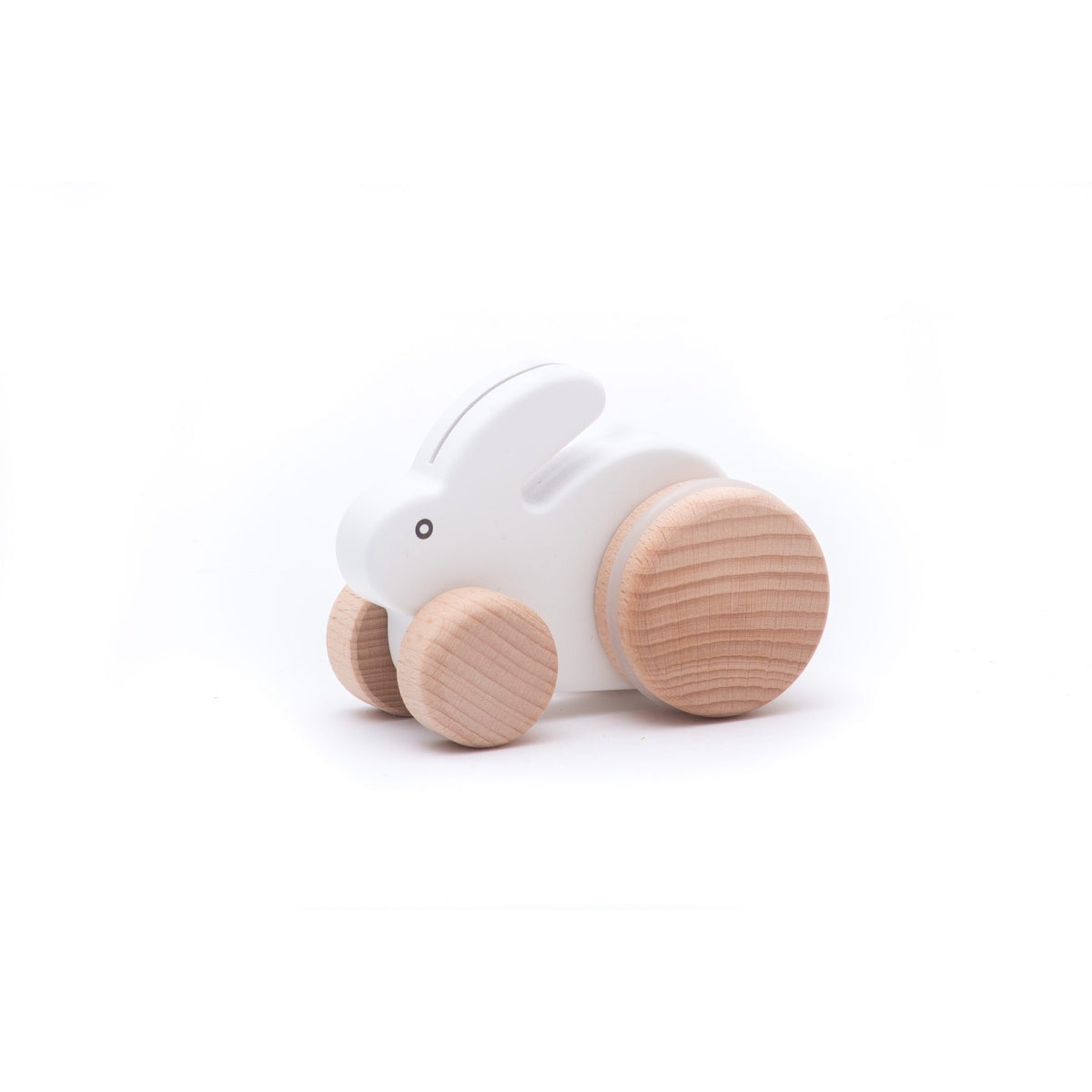 Hoppity hopping along! This scrumptious little bunny rabbit has natural wooden wheels that make it look like it is bouncing up and down as it goes. Made from sustainably-harvested hardwoods for hours and years of play, just push it along and watch it hop hop hop! In soft warm white, this bunny is perfect for getting spring babies up and crawling and walking.
