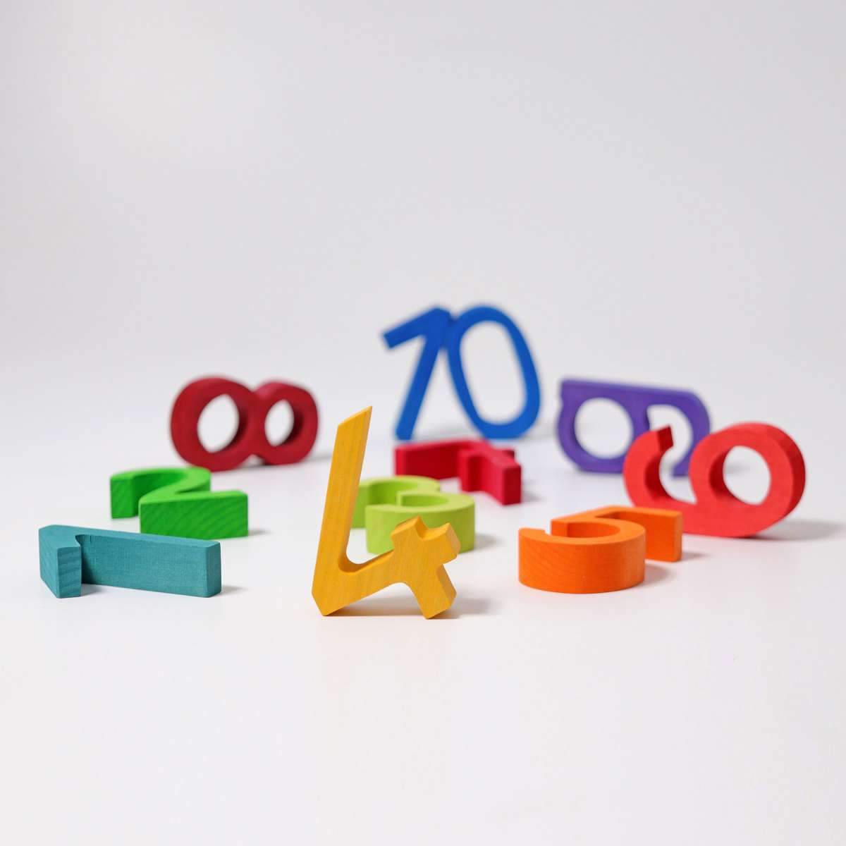 Easy as 1, 2, 3! These solid wooden numbers are fun to stack and play with, even for young kiddos that haven't learned their numbers yet. Lay them out for counting and mathematic activities or stack them tall for impressive feats of balance. In a vivid rainbow of colours, the Building Set of Numbers pairs beautifully with other blocks and building sets from Grimm's. Pair with the Grimm's World of Numbers Rainbow for even more learning fun!