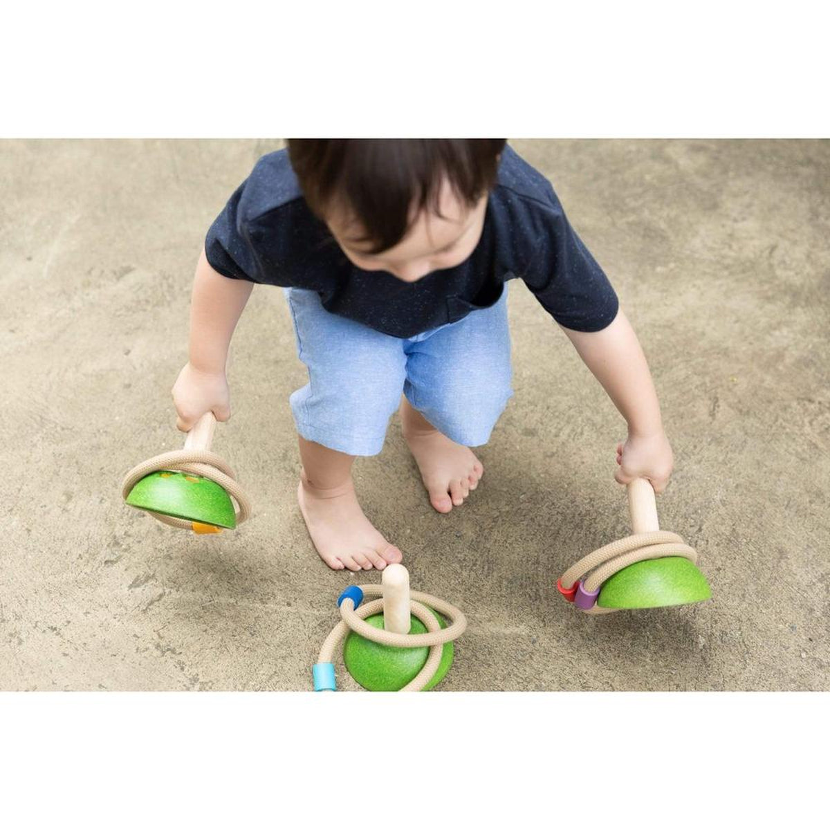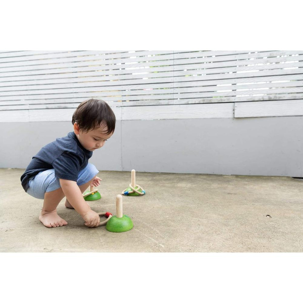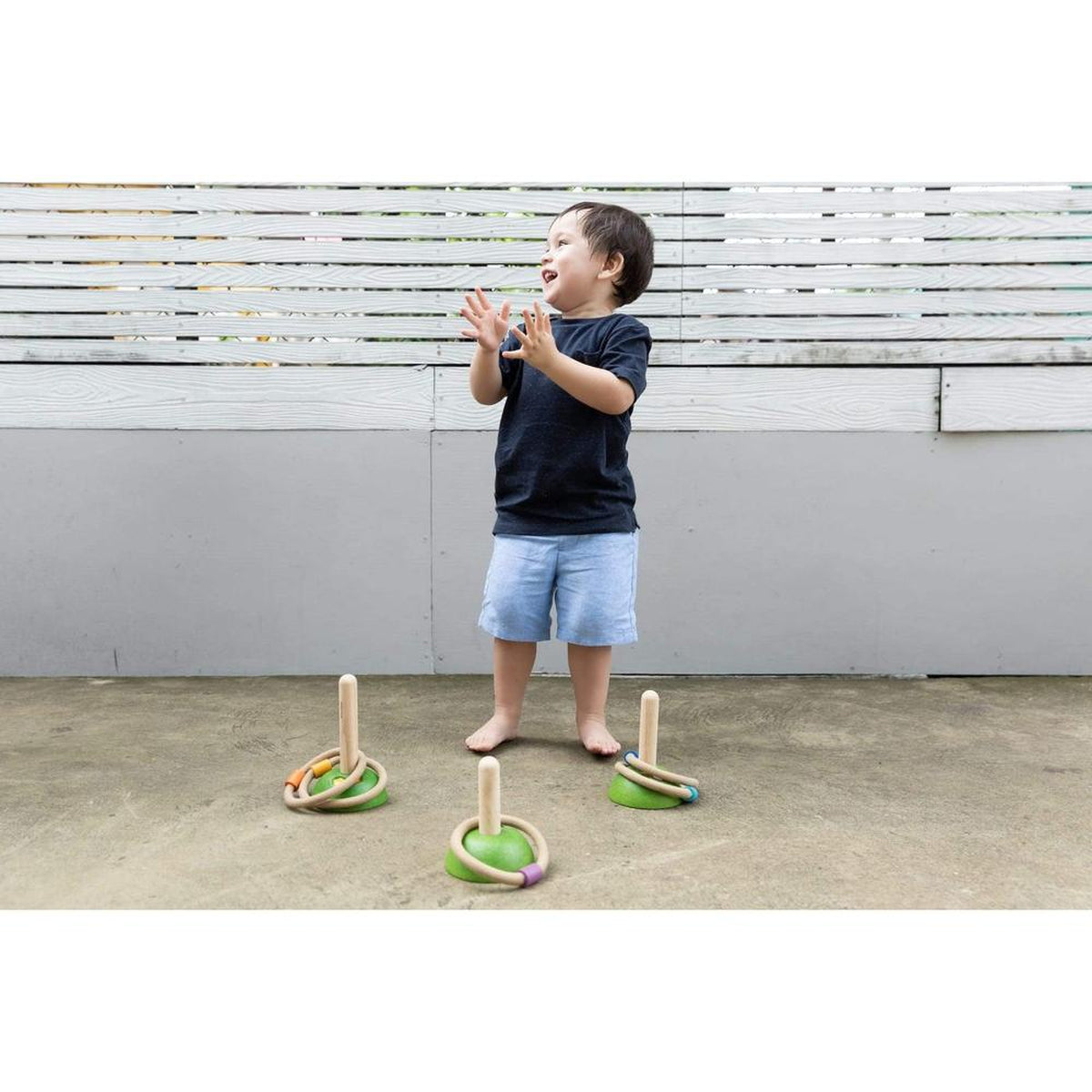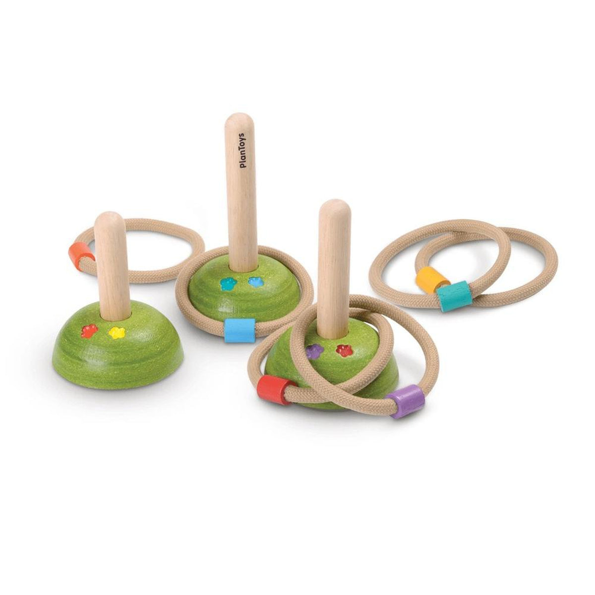 Ready, set, aim! Practice your aim with this fun indoor/outdoor ring toss game from Plan Toys. This colourful meadow-themed game is fun for all aged 3 years and up. Set includes 3 meadow posts of varying heights and 6 rope rings, each with its own coloured bead to identify it. Place the posts close for beginners and spread out for more advanced play.