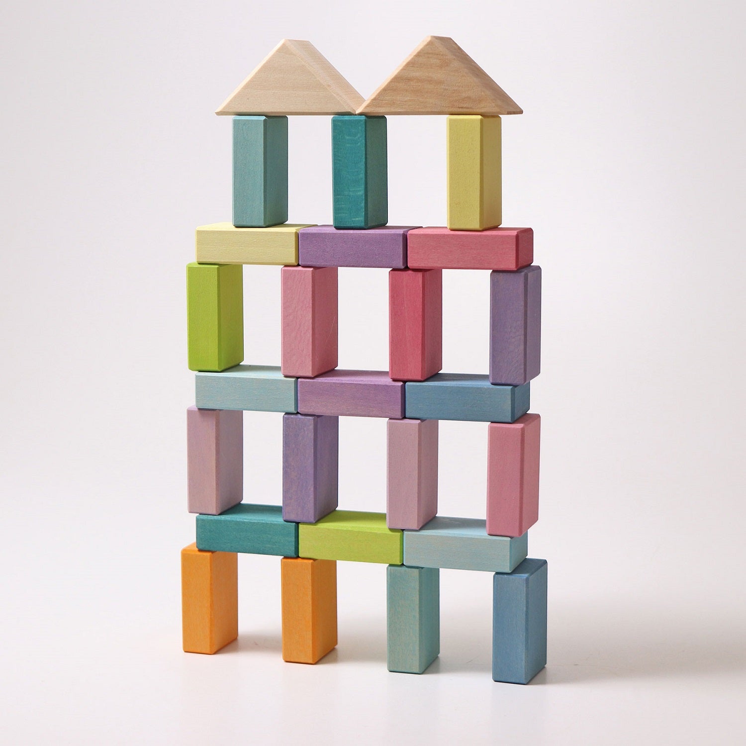Grimms Pastel Duo provides beautiful building material - and everything in duplicate: two different basic geometric shapes, two colour worlds, two types of wood and two building blocks per pastel colour.