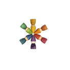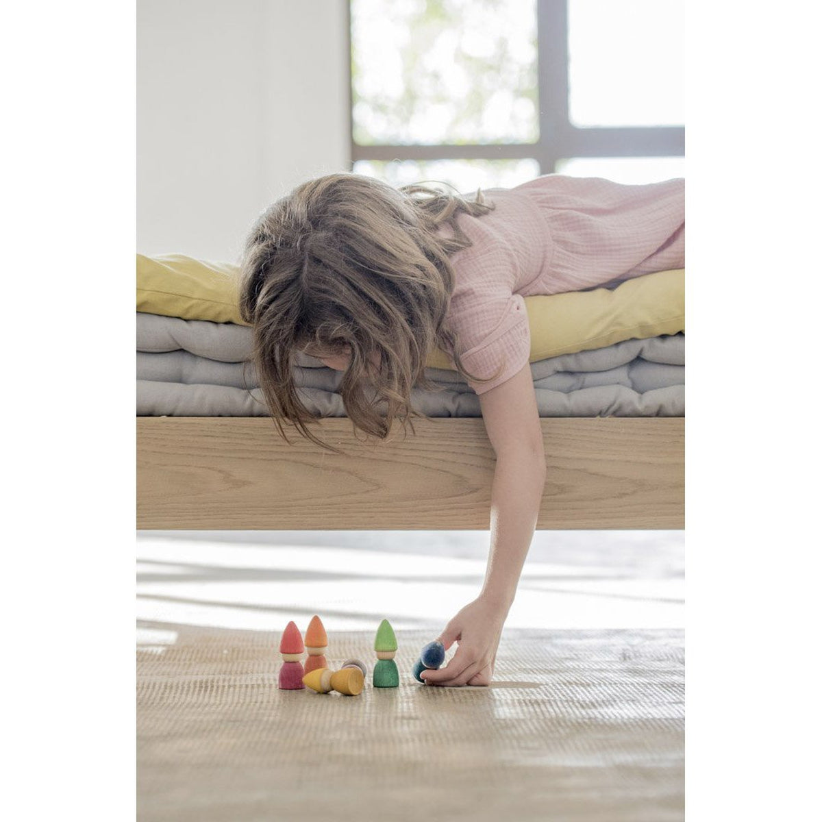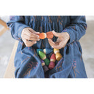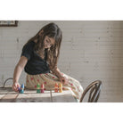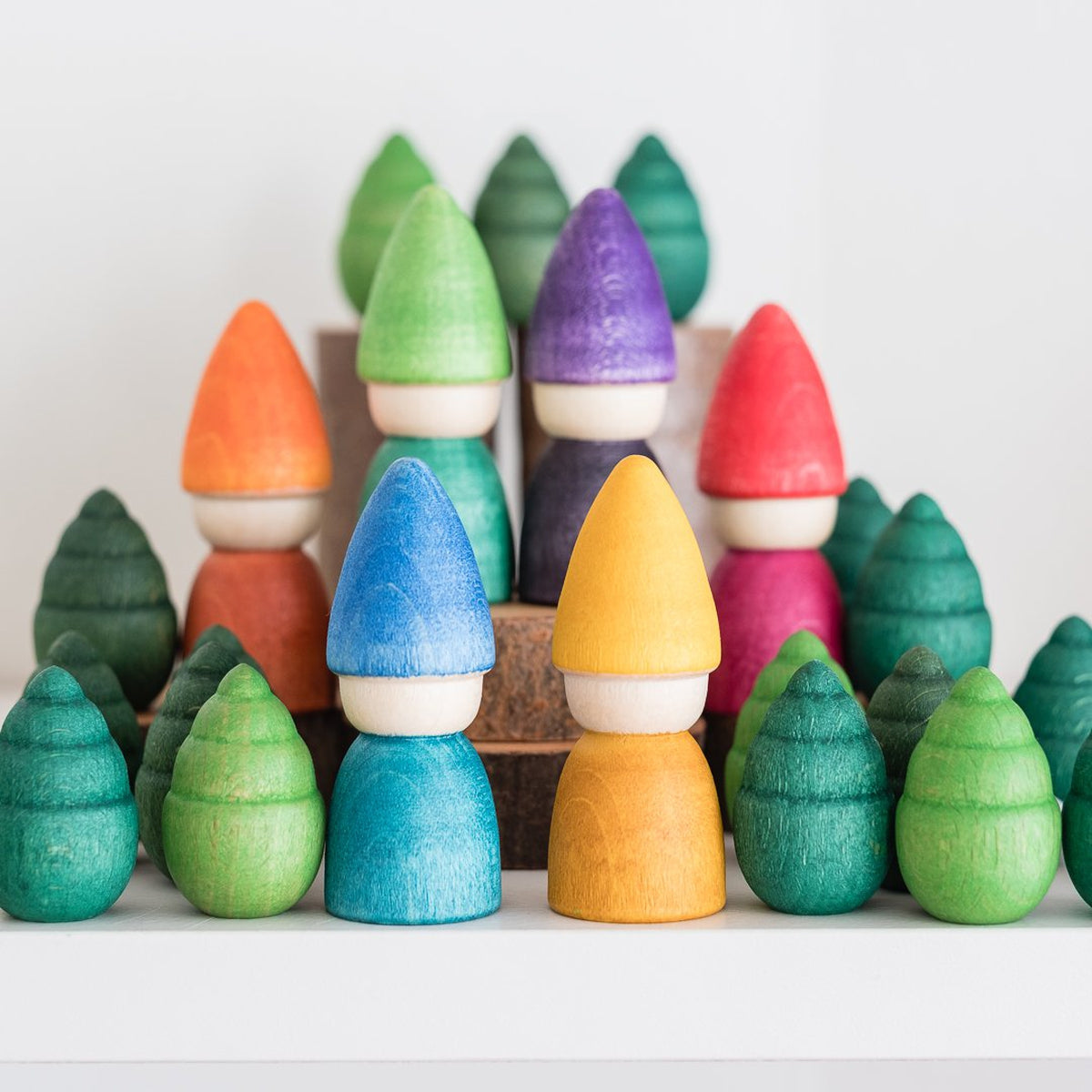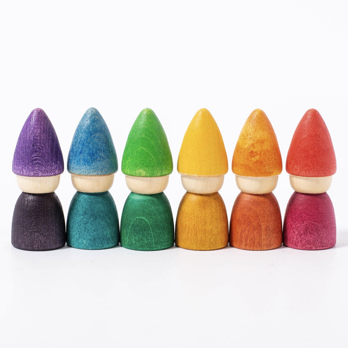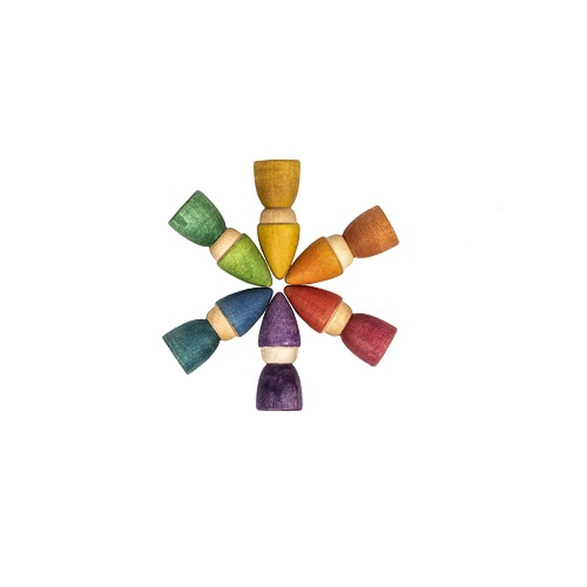 The world of Grapat Nins is tiny, multicoloured, playful, and lovely. Each figure is made with care, showcasing wood in all its natural beauty, with the water-based rainbow stains allowing the grain and knots to show through. These figures are perfect for autonomous imaginary play and their simplicity allows the child to express a variety of scenarios and emotions through the Nins. When not in play, we love thinking of this little rainbow village of wooden friends gazing down at us from a shelf.