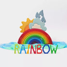 This set pairs perfectly with the large rainbows from Grimms (SOLD SEPARATELY). It is pictured with a large rainbow in the 5th photo to illustrate scale, but the rainbow is not included in this listing. Wooden letters and other Grimms toys sold separately