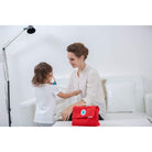 - set includes a stethoscope, blood pressure monitor, thermometer, syringe, reflex hammer, and red cotton carrying case