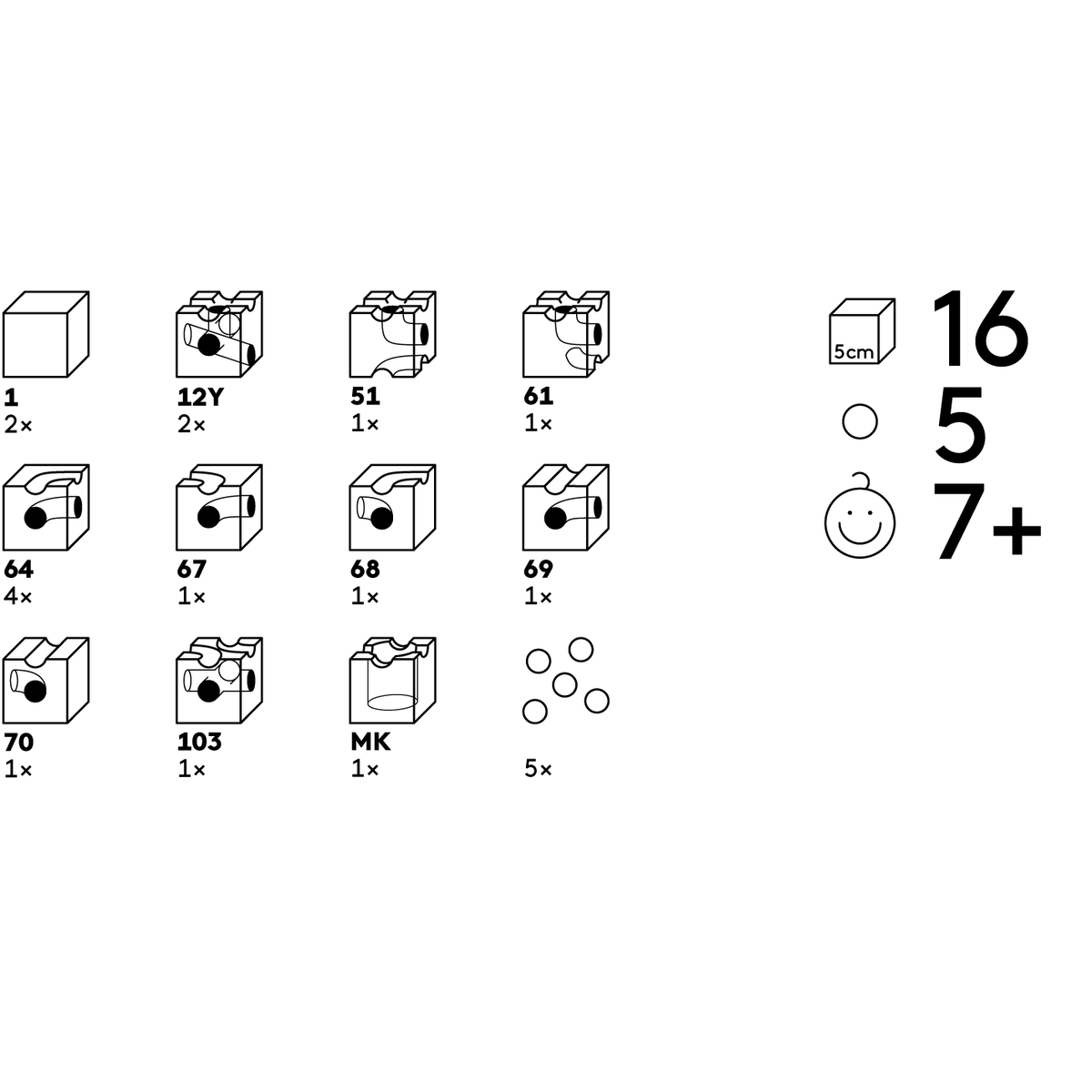 - contains 16 blocks and 5 marbles