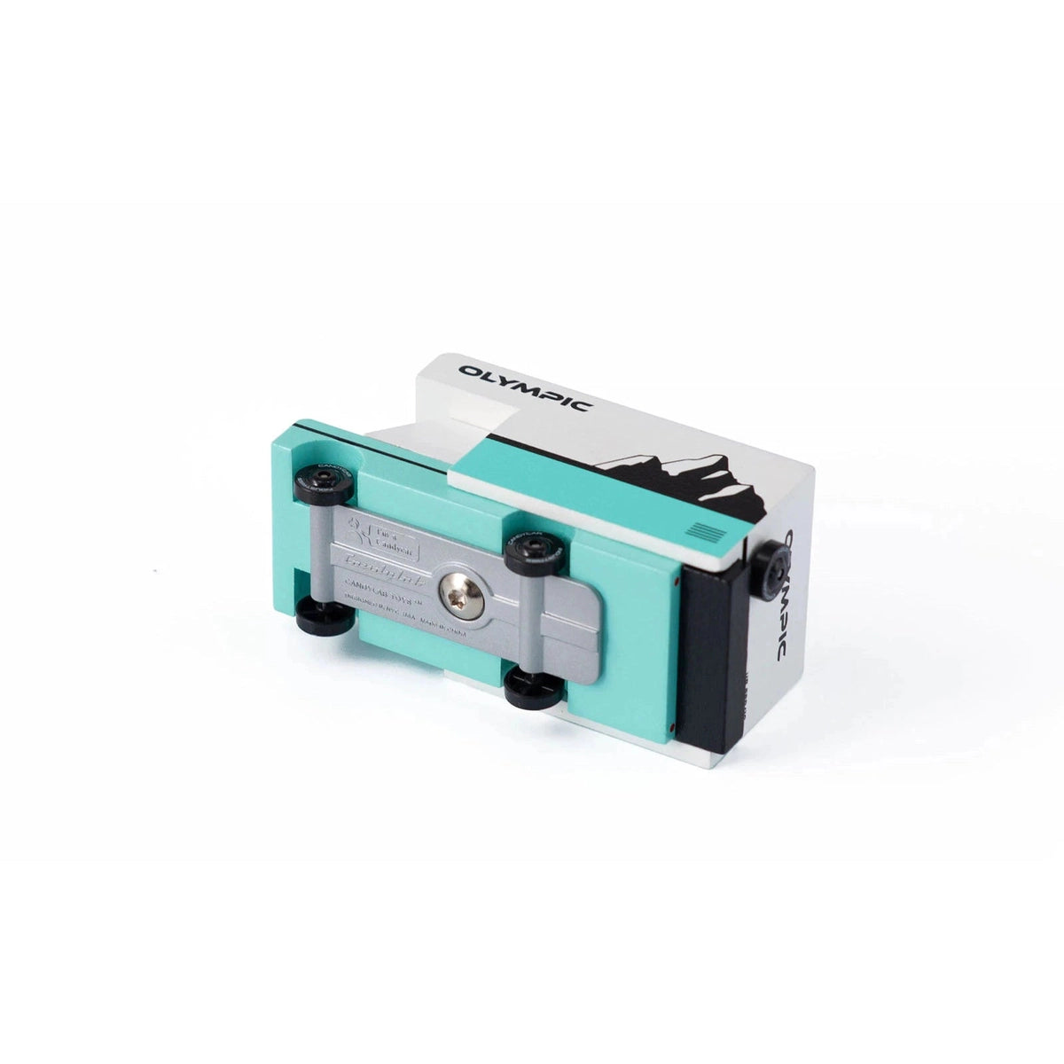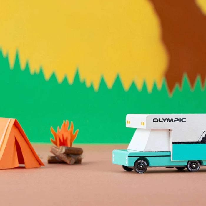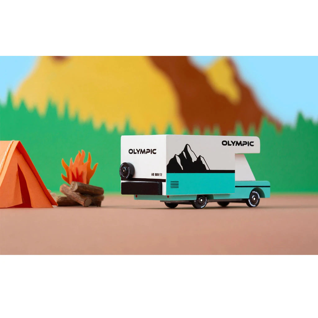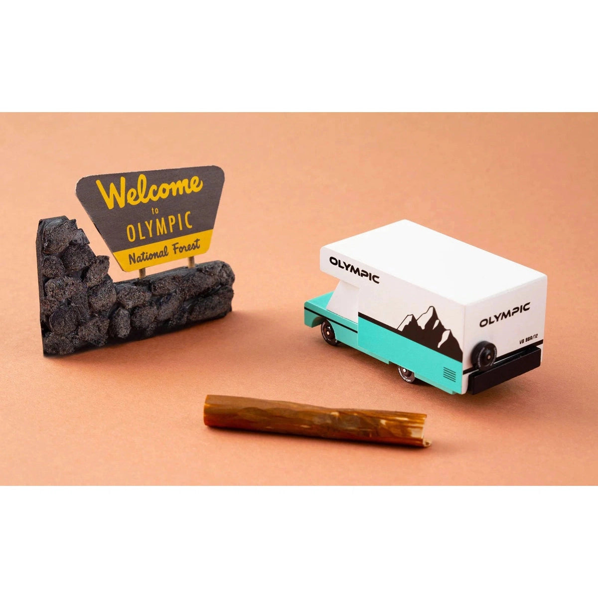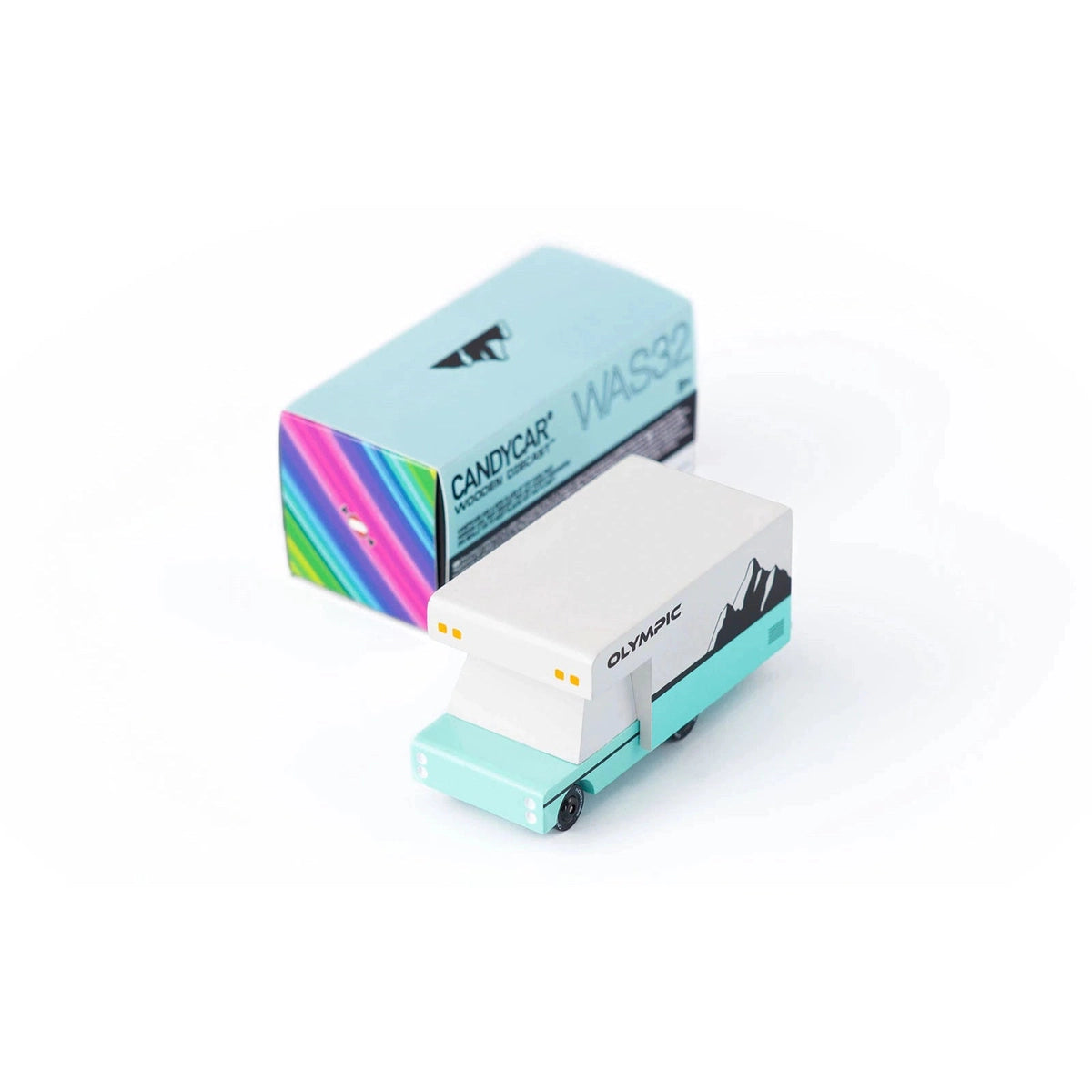 Time to hit the road on a summer vacation! Inspired by the bountiful beauty of the Pacific Northwest and the Olympic Peninsula's snow covered mountain range. Let the epic adventures begin! This lovely little beech wood RV has a spare tire on the back, a beautiful retro aqua coat of paint, and detail of a mountain range.