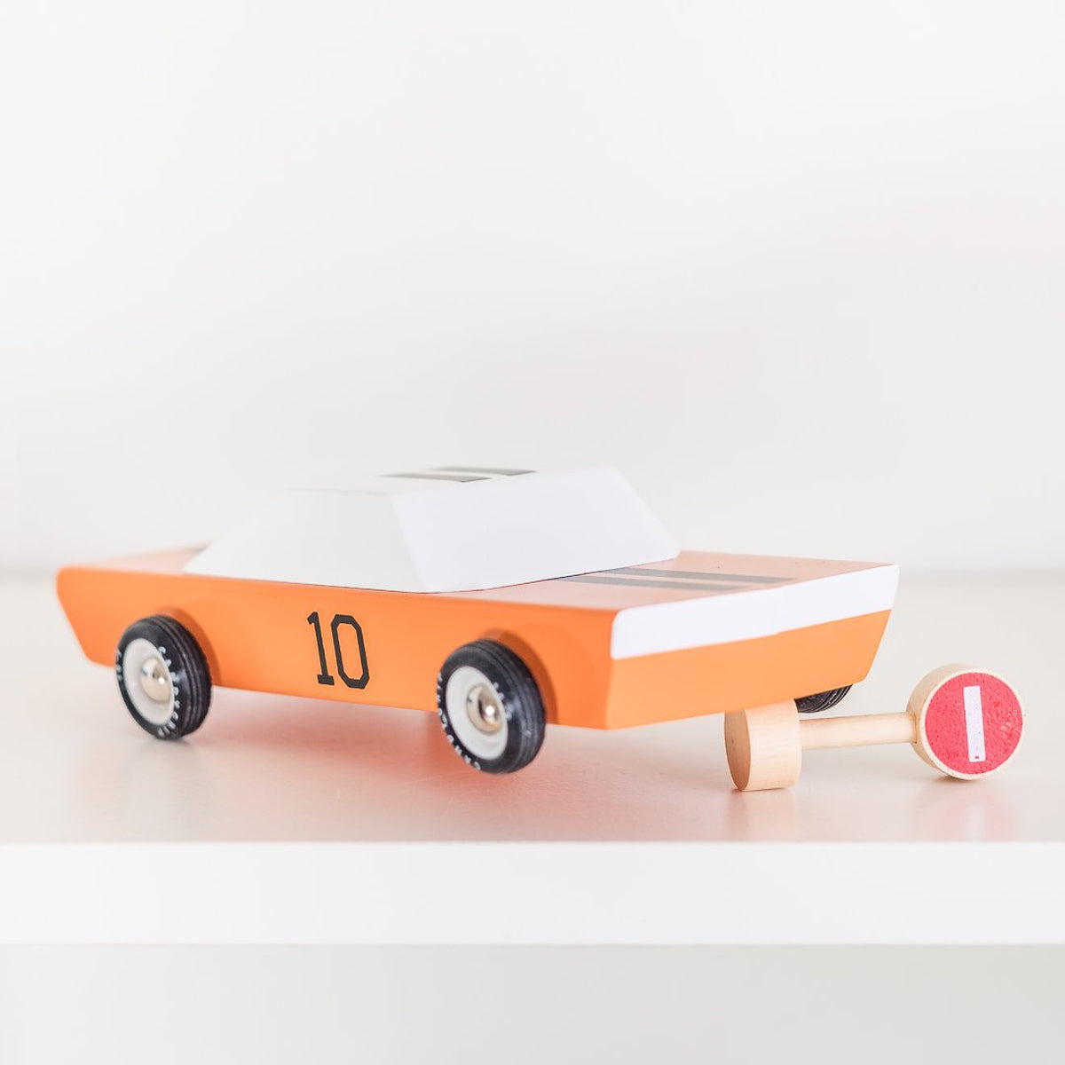 A true American classic muscle car if there ever was one, the orange racer from Candylab has a real soul to it. Bright candy orange with a double black racing stripe, this one is definitely a General among cars. Made of solid beech wood with water-based paint and finished with a non-toxic clear urethane coat for durability. Safety tested with plastic rims and real rubber wheels, the Orange Racer is ready to jump over and zoom past any obstacle.