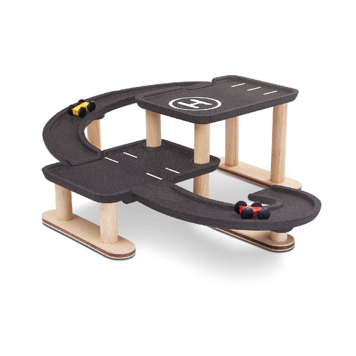 Vroom! Vroom! Coming through! Give your little drivers the perfect track to race and park their cars. Durable and neutral with black PlanWood and natural sustainable rubberwood, this set includes ramps, plenty of parking spaces, and even a helipad! Built to last and a great set for an ever-increasing car collection, your little ones will have hours of imaginative play acting out races, auto emergencies, and all sorts of motorsports.