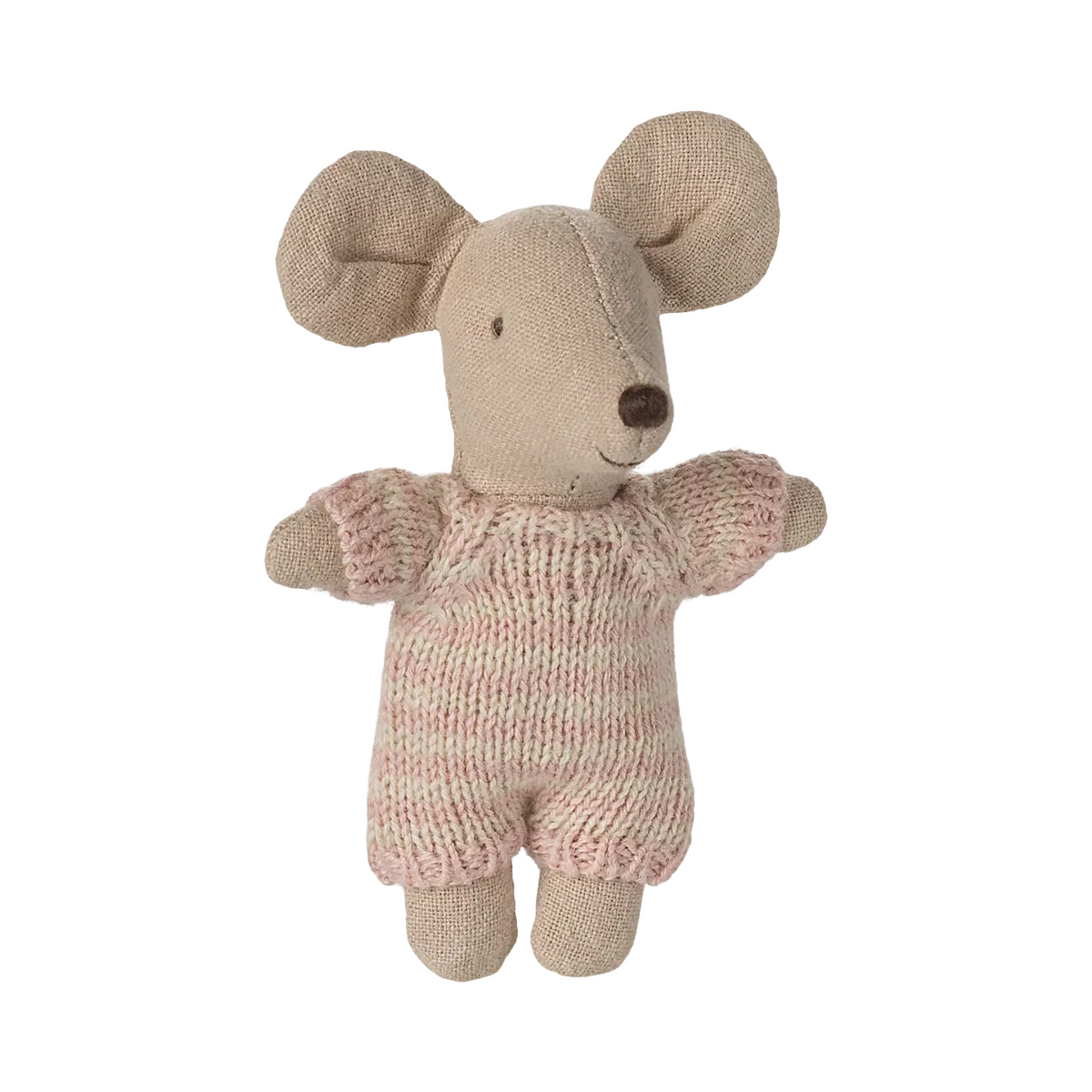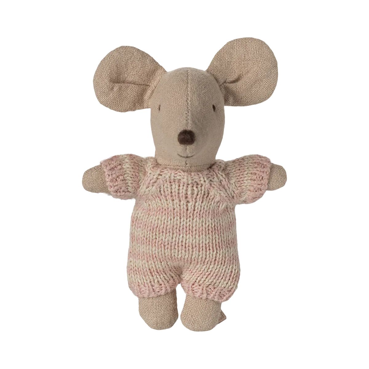 A small baby mouse in a soft and striped knitted suit. It sleeps for hours in its little quilted carry cot.