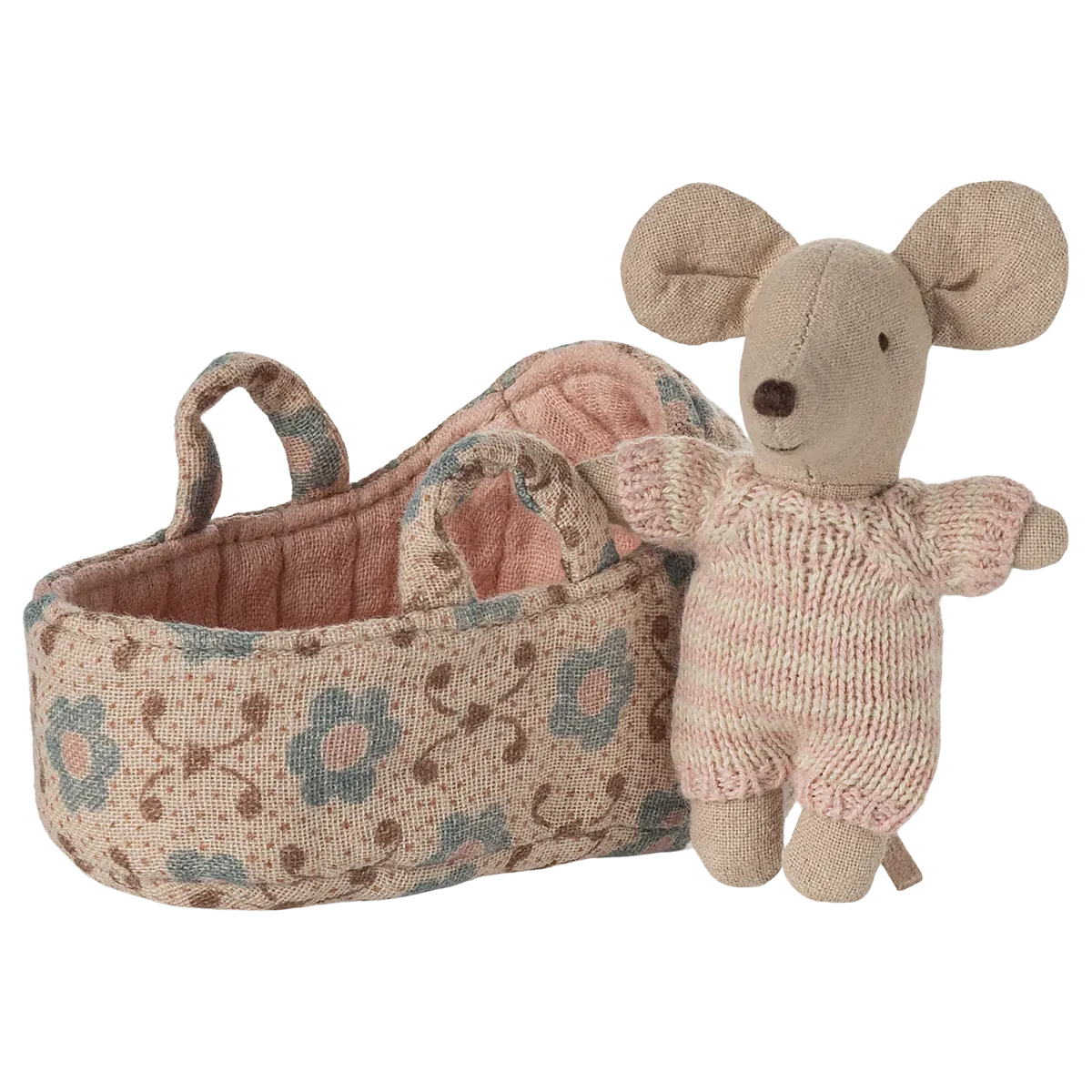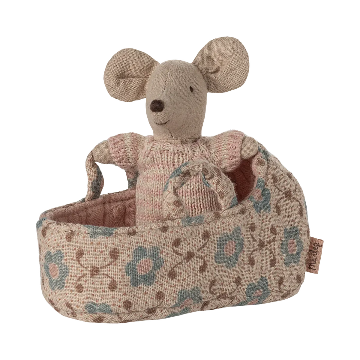 Maileg baby mouse in carry cot - rose