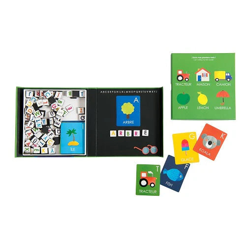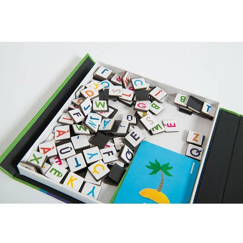 Welcome to the Popipop learning collection by Moulin Roty. Magnetic box is a excellent work station for exploring the alphabet using brightly coloured magnets and prompt cards. Magnetic cardboard game to discover the alphabet and reproduce your first words! On the magnetic plate, form the words using 168 letter magnets, following the 26 cards illustrated in Popipop colours, in French / English!