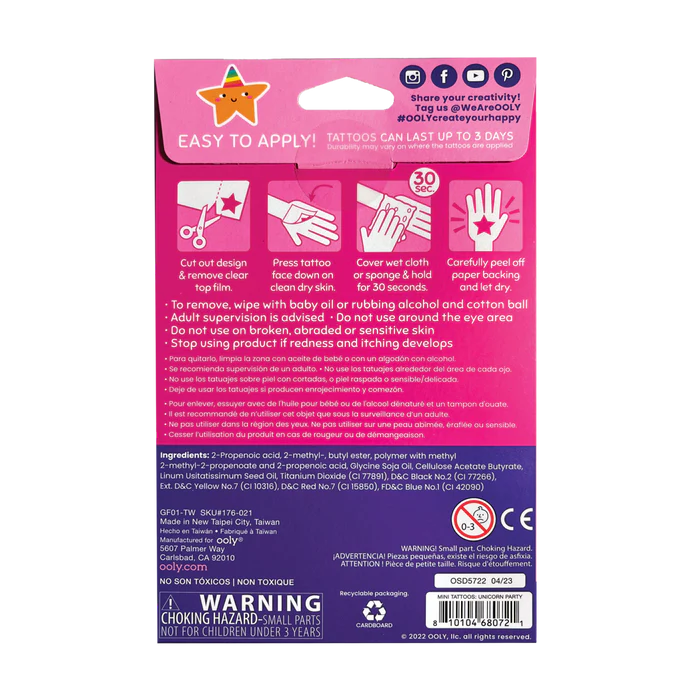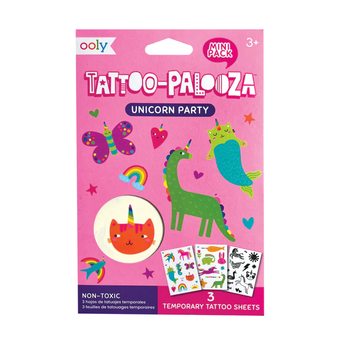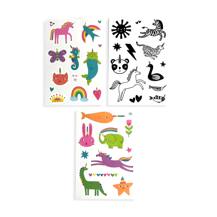 Happy was just made wearable with these unicorn party tattoo sheets. Durable and long lasting, these charming temporary tattoos are perfect for birthday parties, sleep overs, or any gathering of creative kids! What does it take to throw a unicorn party? Just put on some of these temporary tattoos, bring your imagination, and you’ve got a shindig that’s magically amazing! This mini pack includes three tattoo sheets of temporary tattoos that are constructed to be durable and long-lasting. Two sheets are in full color and one is in black and white. Designs include unicorns, butterflies, hearts, rainbows, and more. These are perfect as party favors, as a party activity, or even just as a fun thing to do on a relaxing afternoon with your little one!