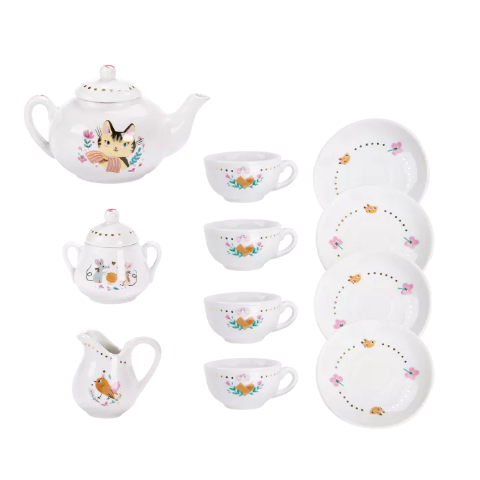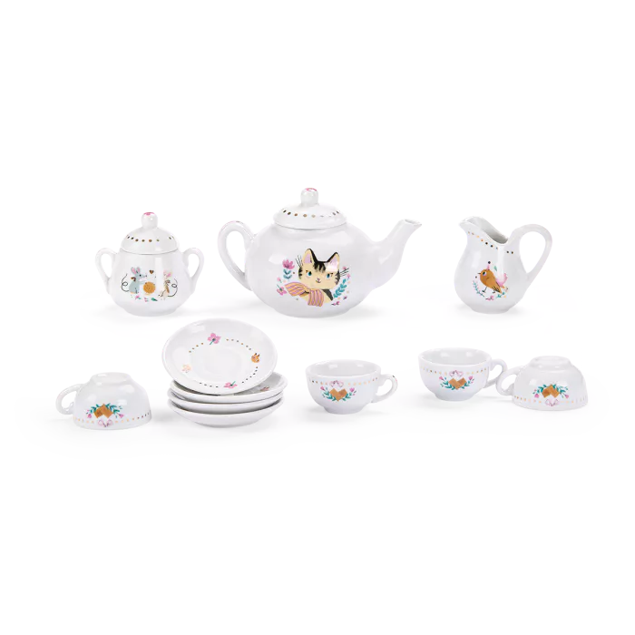 Pour a steaming hot cup of imaginative play! This porcelain set is decorated with delicate flora and fauna motifs and is presented in a lovely carry box. Tea sets are fantastic for social development (even when the only guests are dolls and stuffed animals!) and will help your little one develop their vocabulary, sharing skills, motor skills, and imagination.