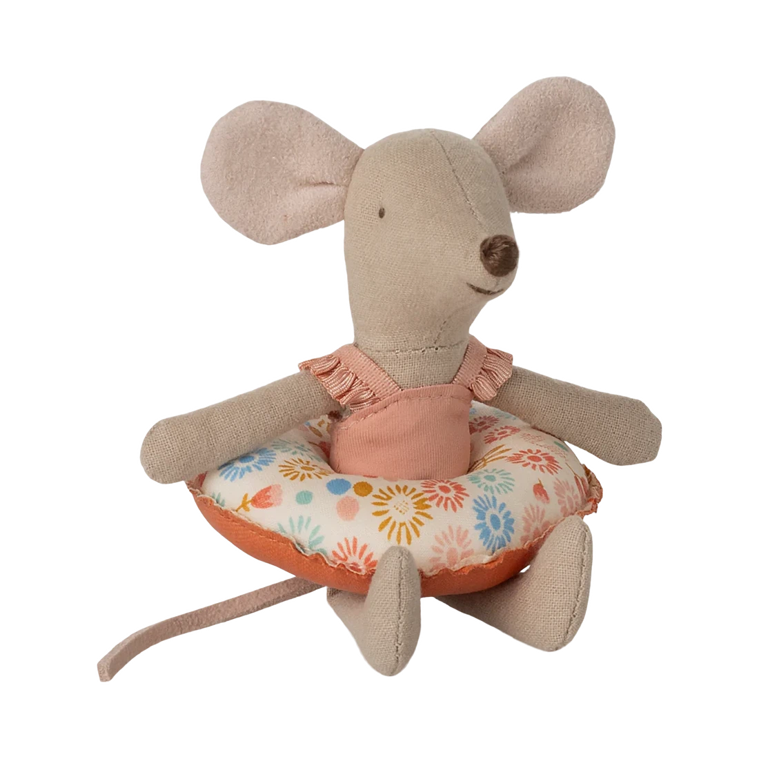 This summer set exist of a little sister mouse dressed in a rose colored swimsuit with her flower printed float around the stomach. She is now ready for a safe swim in sea.
