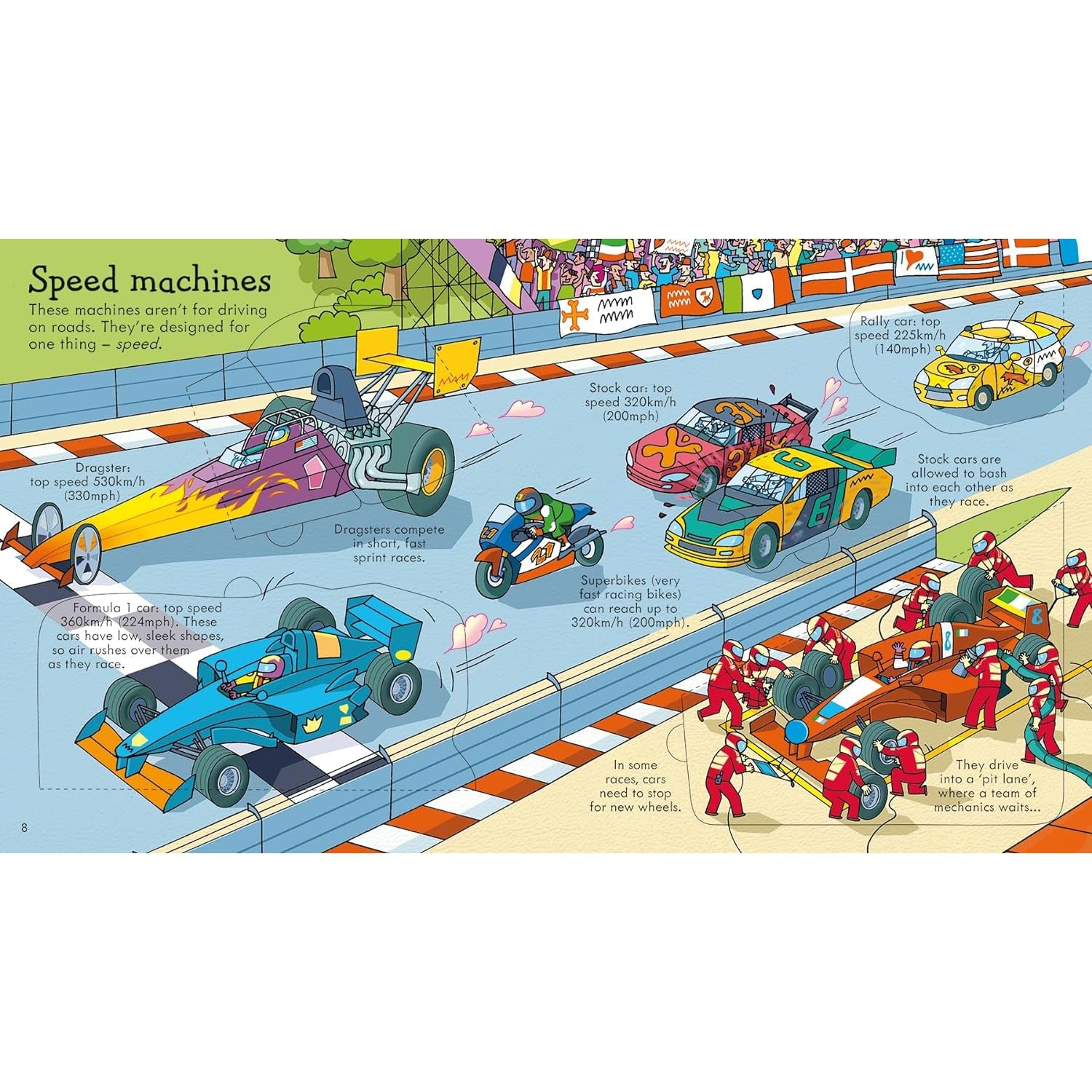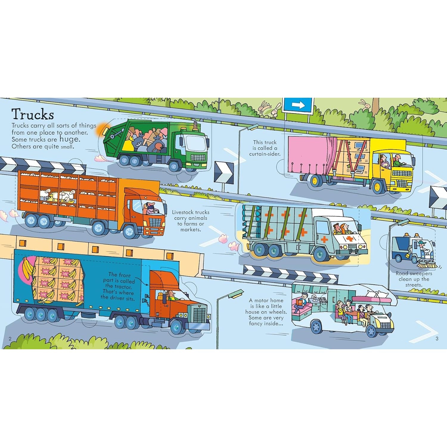 Lift the flaps to explore all sorts of exciting vehicles - bulldozers rumbling around building sites, fire engines rushing to emergencies, and jumbo jets soaring into the skies. With fascinating facts about every vehicle, from speed machines to giant trucks, emergency vehicles, tractors, and planes all geared to delight inquiring minds. The colorful scenes are covered with flaps, each packed with even more detail to entertain young readers.
